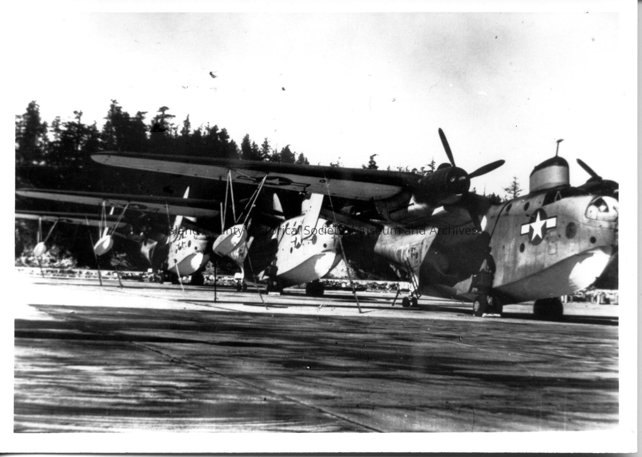 A photo of several navy PBYs on the ground. One in front. Black and white photograph.
