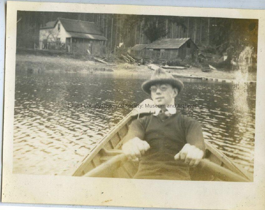 A black and white photo of a man rowing a rowboat. He is wearing a hat. He is leaning back. The photographer is probably in the rowboat with him. Onshore are some wooden buildings, shed or barn, house with a porch.