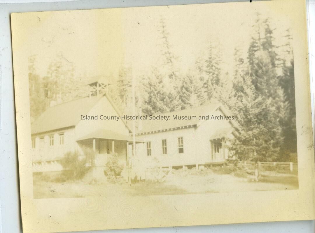 A black and white photo of two wooden buildings - one is probably a school - it has a cupola structure on the peak of the roof above the front door. It has a porch. There is probably a pole in front. The other building is long and up on short pilings or stilts. It has a fence and possibly a ramp leading to the door.