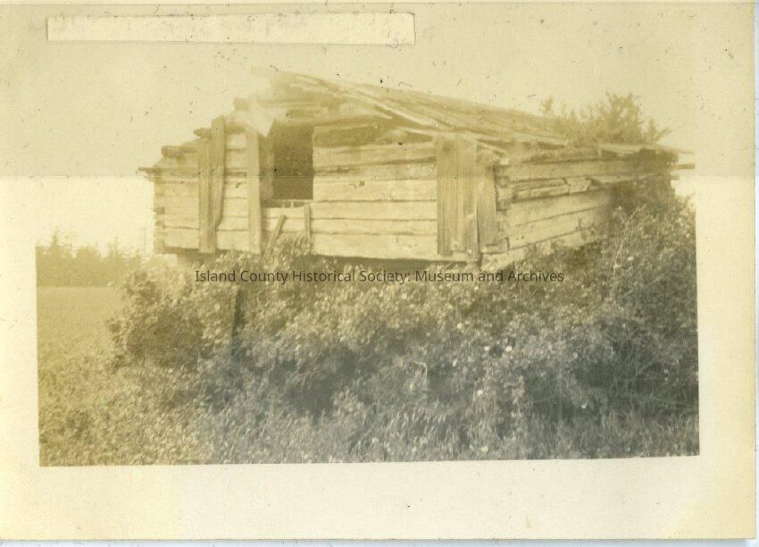 A black and white photo of a wood plank building - a blockhouse in central Whidbey. The uppper level has a square opening. There are bushes around the base of the building.