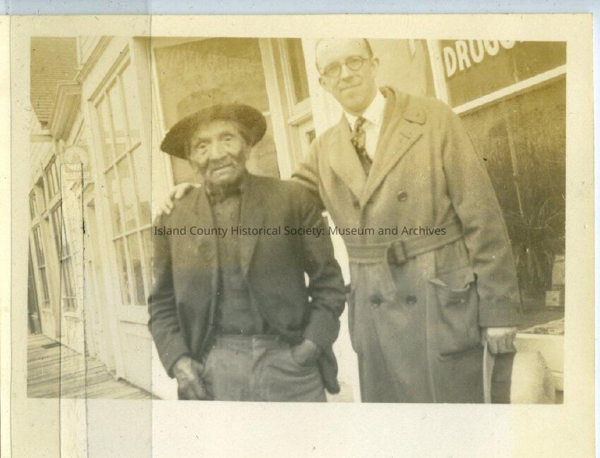 A black and white photo of Chief Snakelum standing beside a George Kellogg in a trench coat who has his right arm around the Chief's shoulders; he is holding a hat in his left hand. The Chief is wearing a sport coat, hat. They are on a planked walkway in front of some stores: Drug(store) and there is one with a sign with a telephone. On the back: "Oak Harbor or Coupeville".