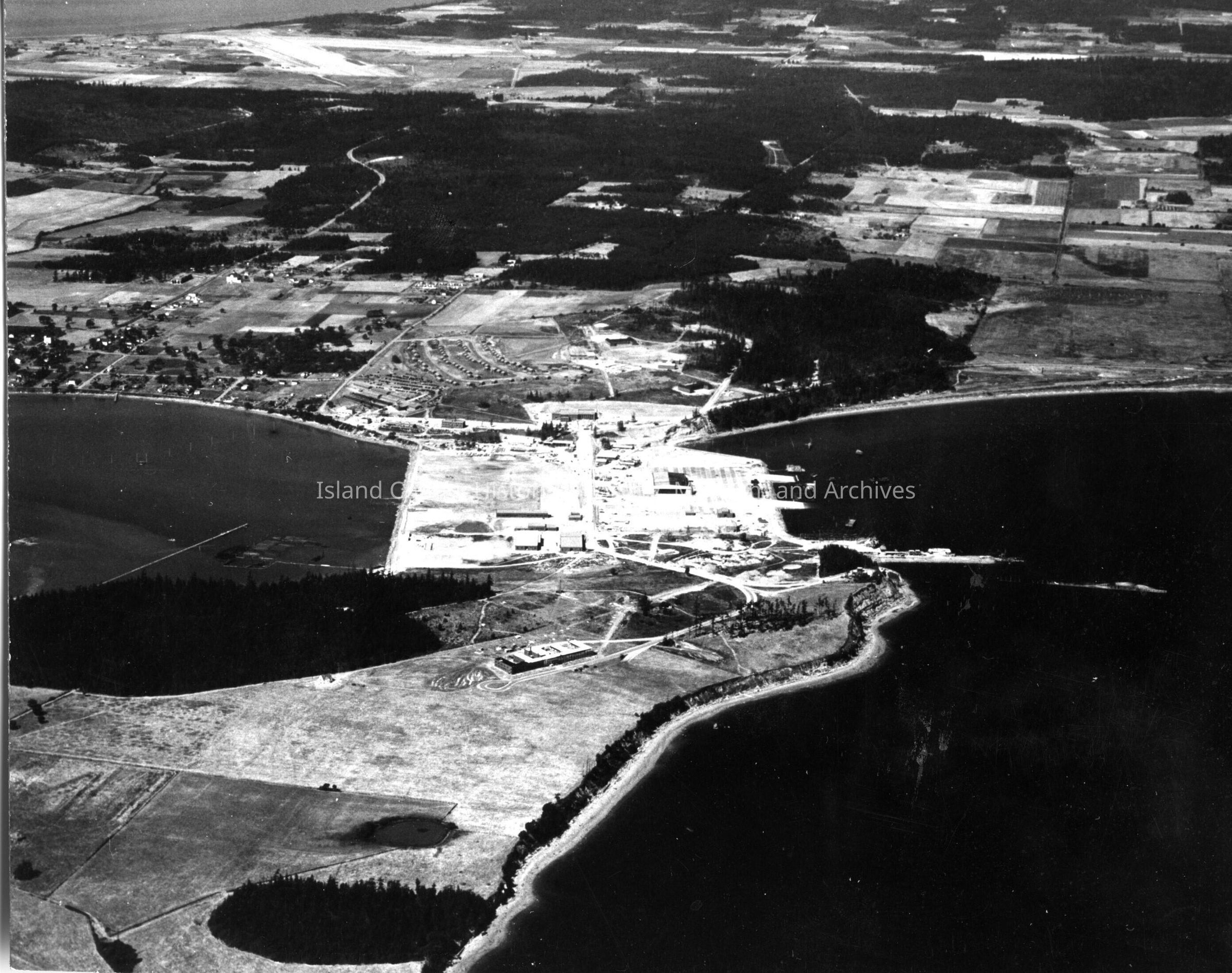 A photo from above the land where the navy base is. It is on a cardboard piece. Black and white photograph.