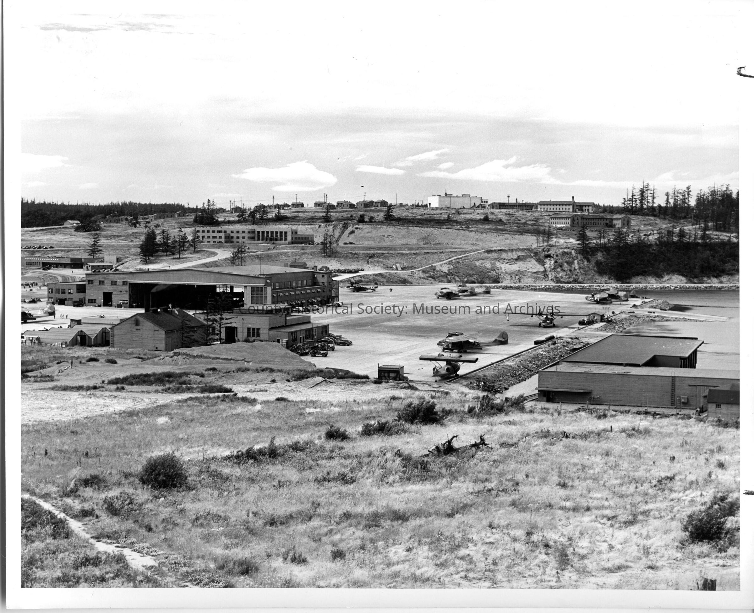 A photo from above the land where the navy base is. On the back is typed "U.S> Naval Air Station, Whidbey Island, Washington, WHID 4374, July 1945, Made for: Public Information Officer. Subject: Seaplane Base from control tower, U.S.N.A.S.