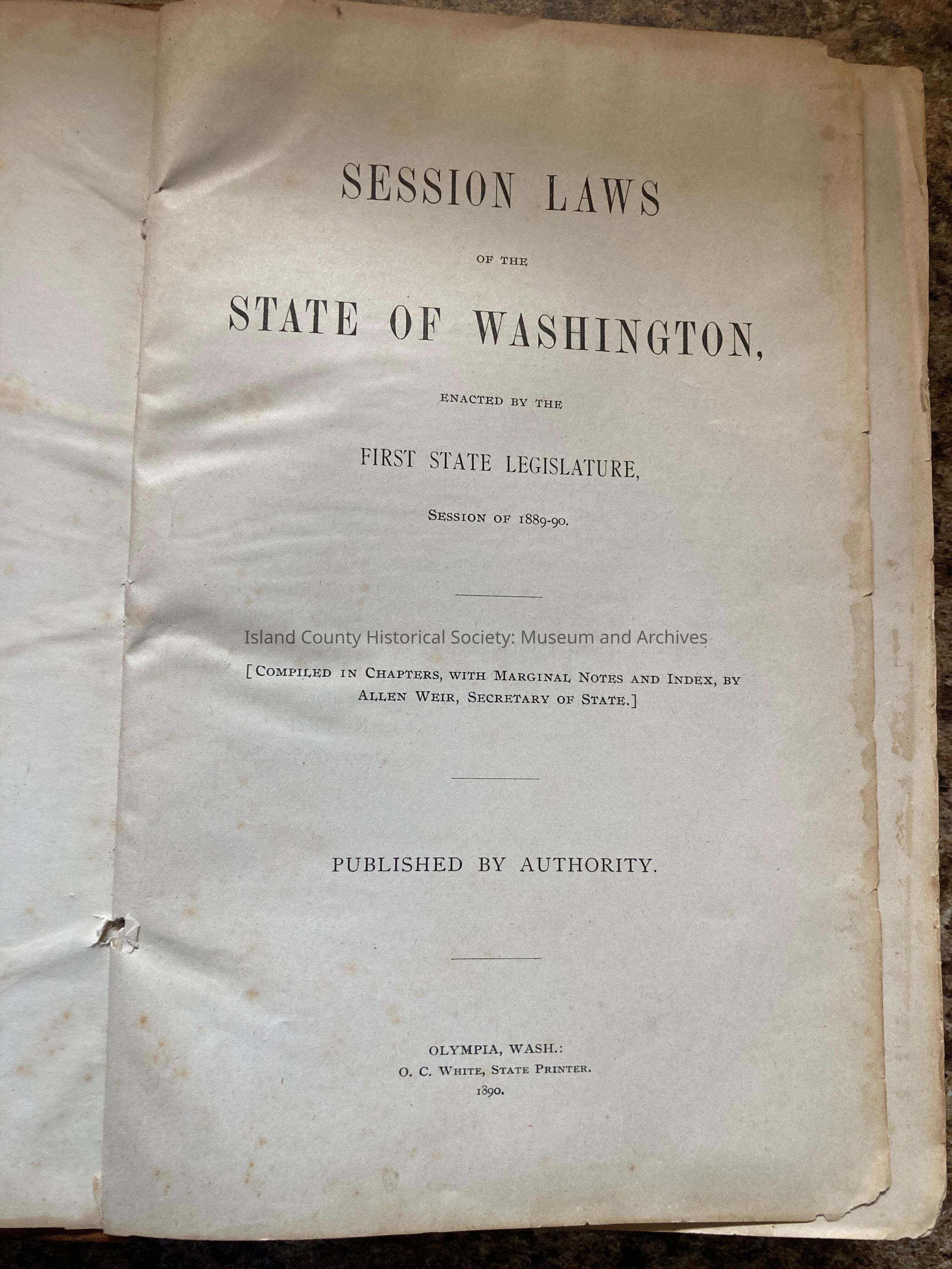 Weir, Allen, Session Laws of the State of Washington; Session of 1889-90, White, O.C., State Printer, 1890. ICHS #89-7-8 1.23