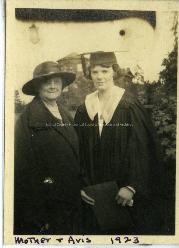 A black and white photo of a young woman wearing graduation robe and hat (mortarboard) with tassels She is holding a diploma in her hands. An older woman is on her right, wearing a coat and hat. A water tower is behind them. On the bottom: "Mother & Avis 1923". Lillian Butters Kellogg and Avis Marguerite Kellogg. Avis was the second person to graduate from the University of Washington Nursing School.