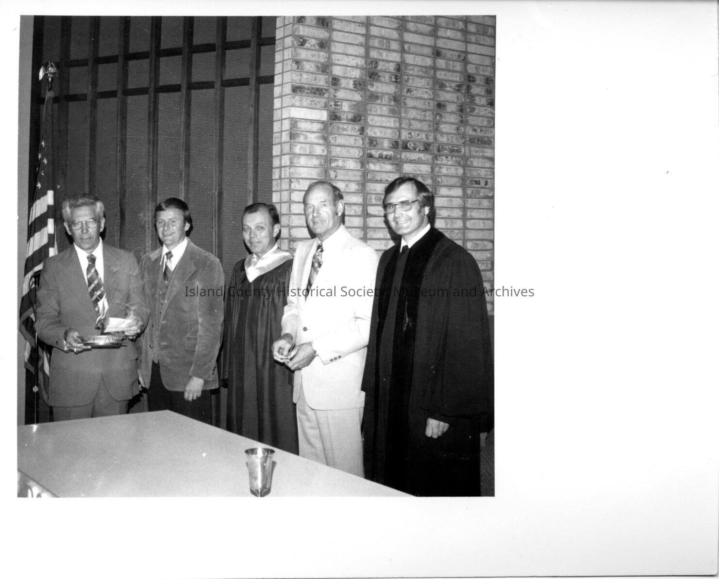 A photo of several men standing by a table. Black and white photograph.