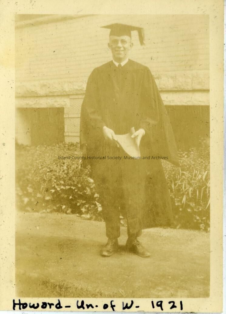 A black and white photo of a man in a graduation gown/robe, mortarboard and tassel and holding a diploma in his hands. He is in front of a brick building. On the bottom: "Howard - Un. of W. 1921".
