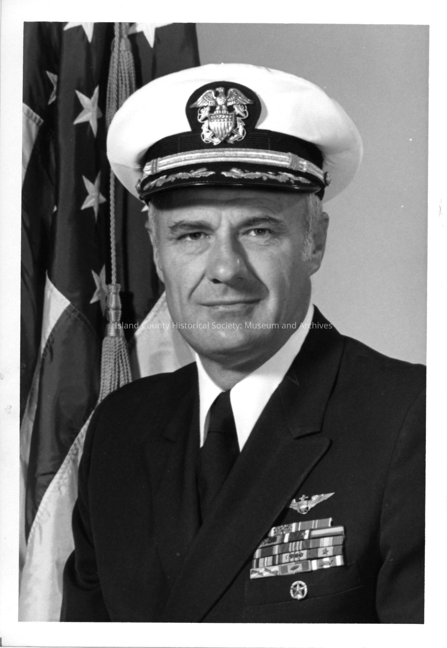A photo of portrait of a navy officer. Typed on the back is "Captain James M. Seely, USN, Outgoing Commanding Officer, Naval Air Station, Whidbey Island."