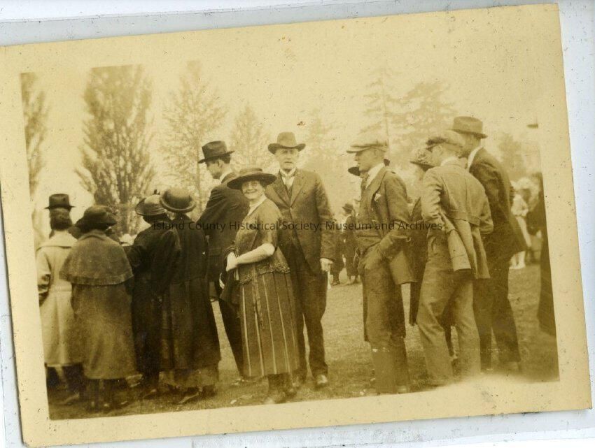 A black and white photo of a group of men and women - dresses, hats, suits, coats. Couple in center Lillian and Albert Kellogg at Howard Kellogg's graduation from University of Washington, 1921. They were divorced at this time and did not along.