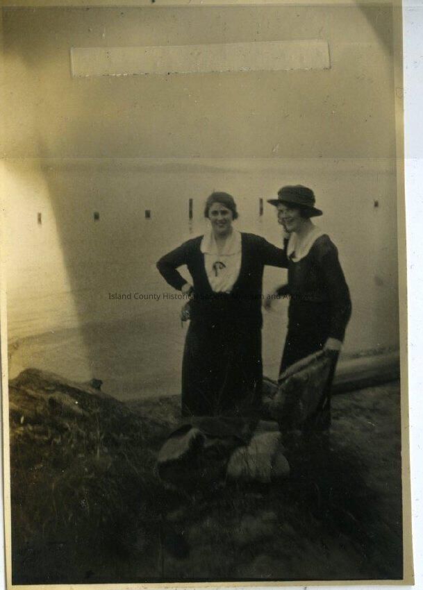 A black and white photo of two women on a shore. The women are in dresses/skirts and one is holding a coat and wearing a hat. Woman on the right is Avis Kellogg. Related photos: 2015.074.444-.447.