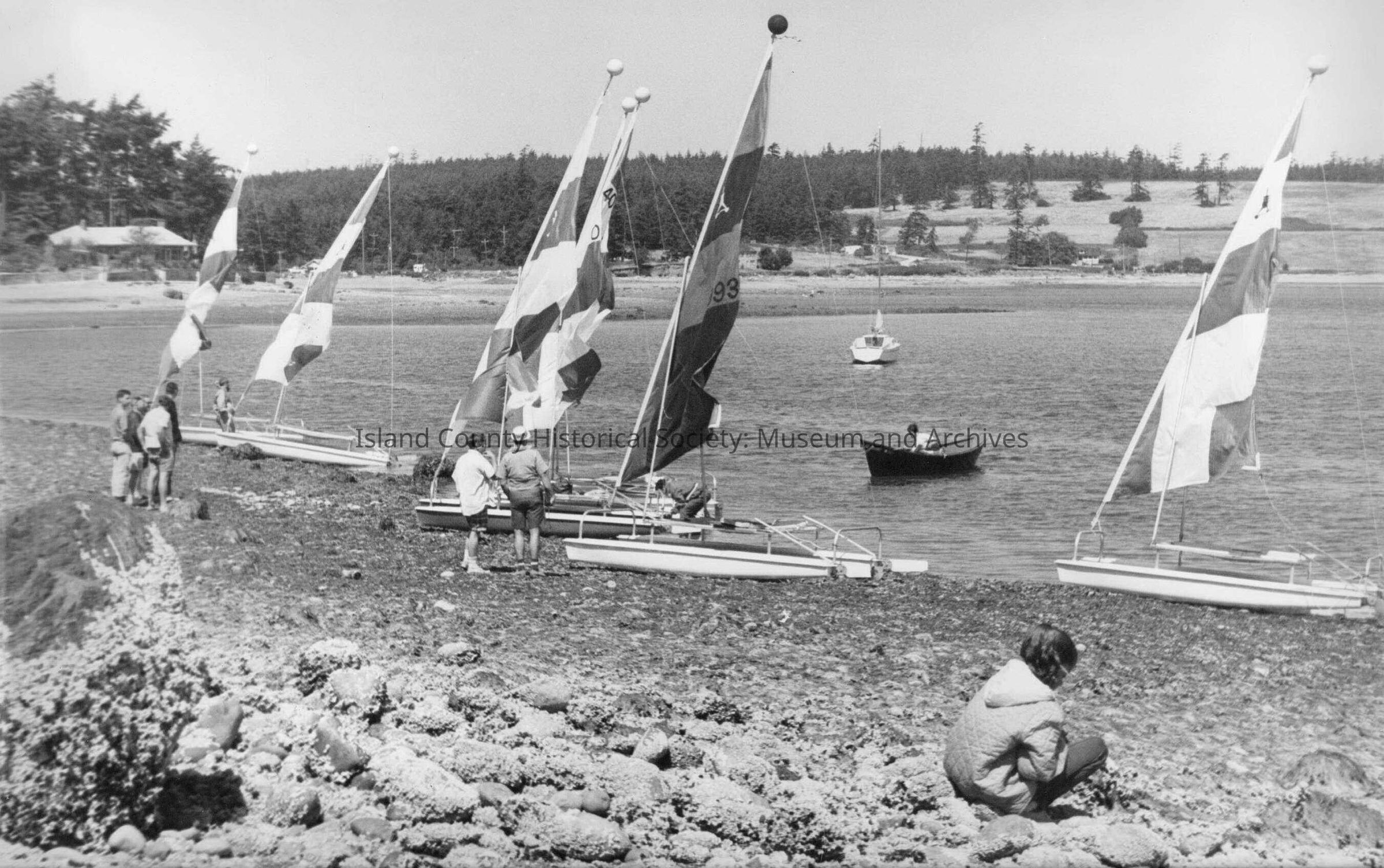 Part of a Wallie Funk photo display small sailboats, child playing on the rocks in the foreground.