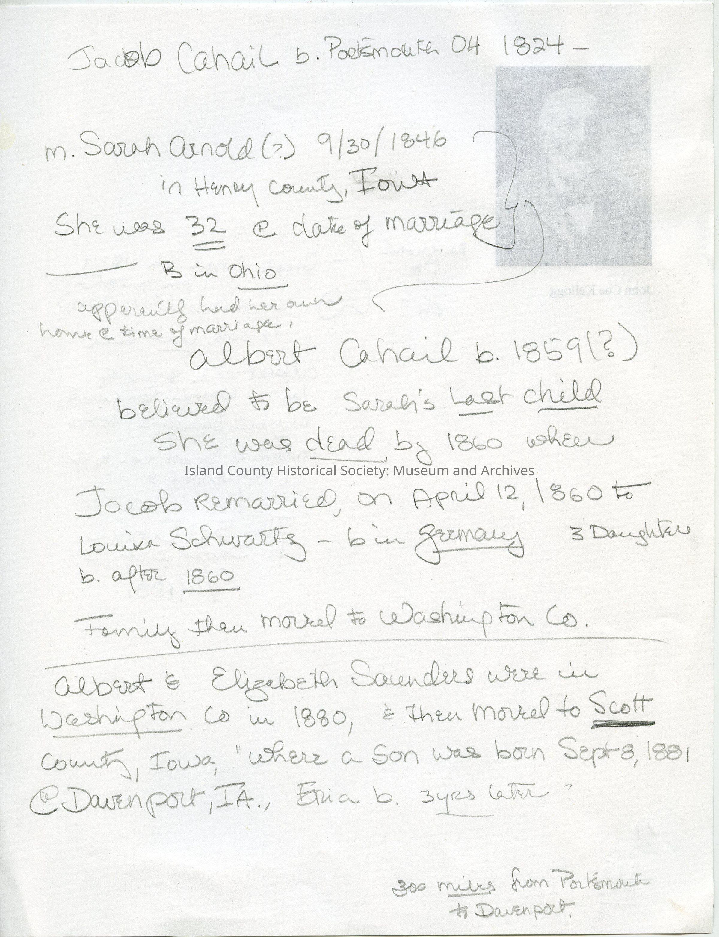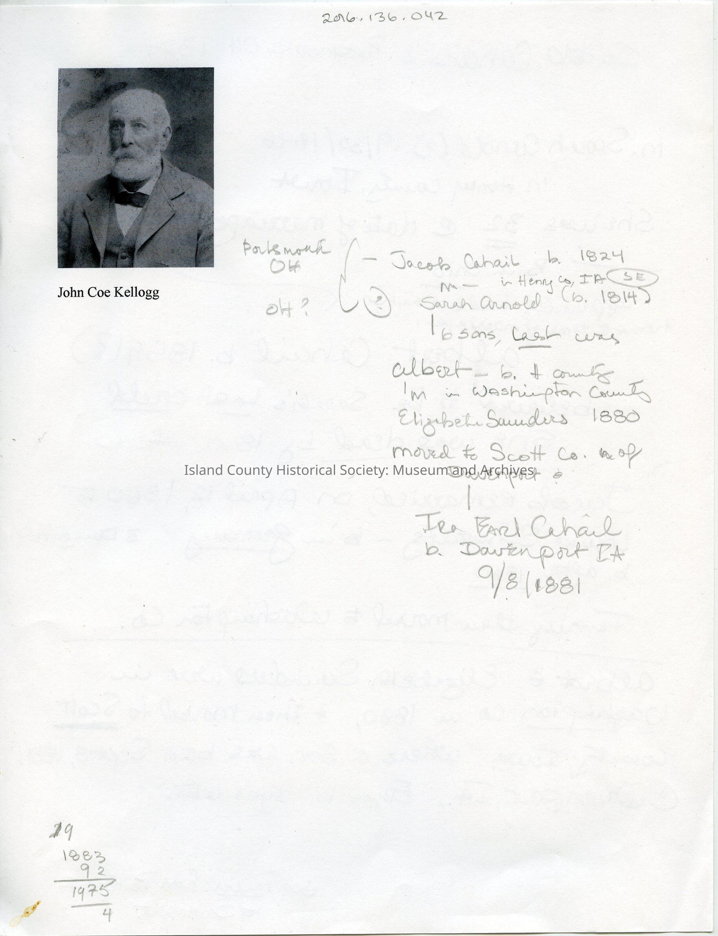 Handwritten notes and photocopy of John Coe Kellogg. On the Cahails.