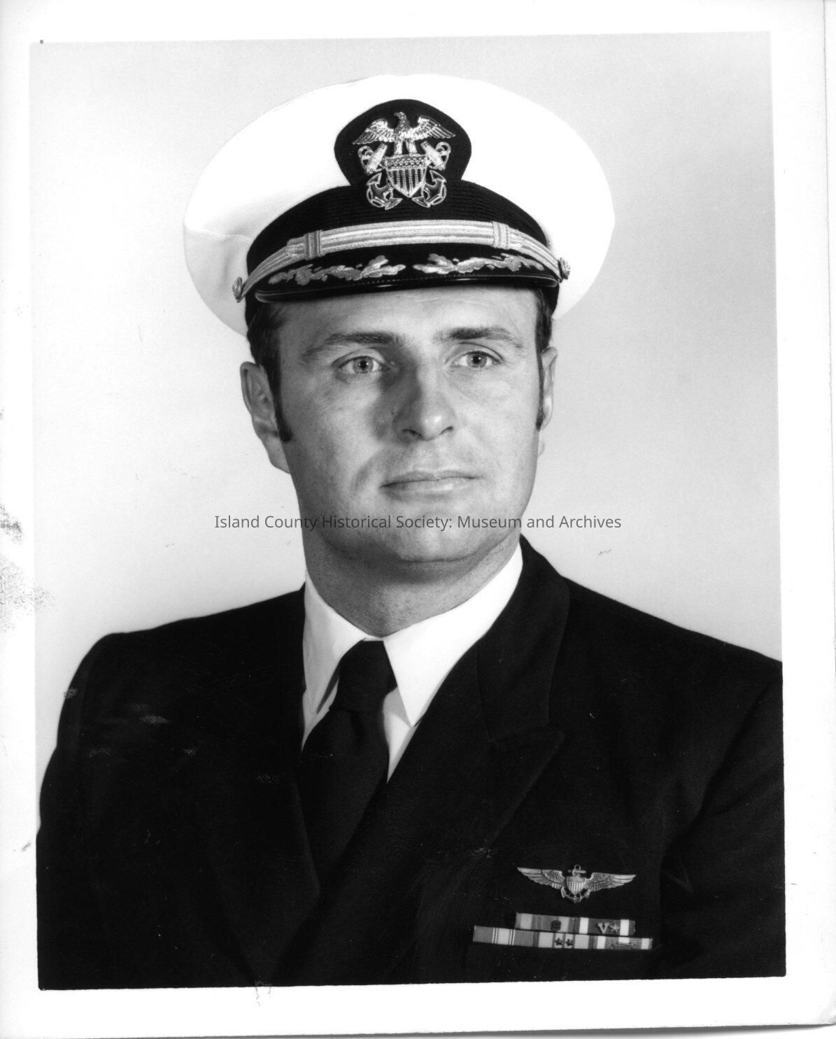 A photo of a navy officer. Typed on the back is "Commander Vince Huth, USN." Black and white photograph.