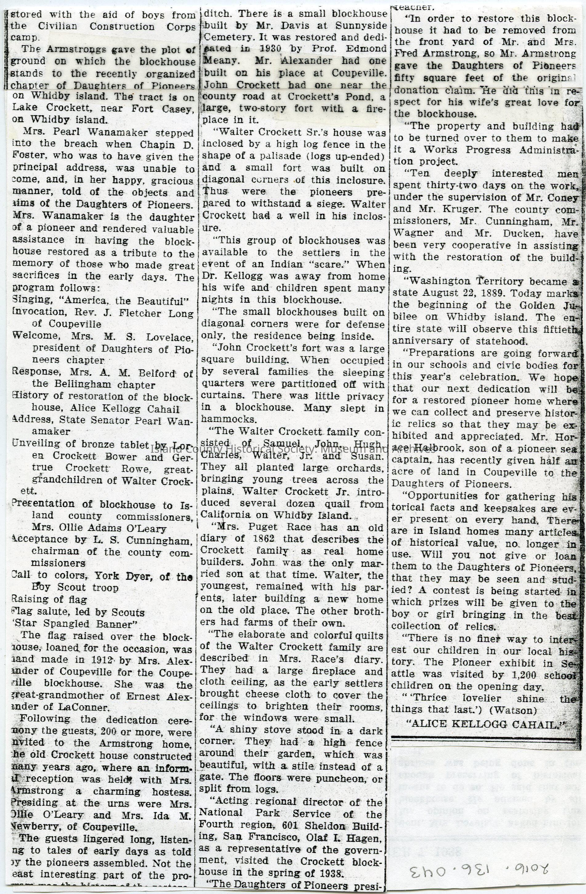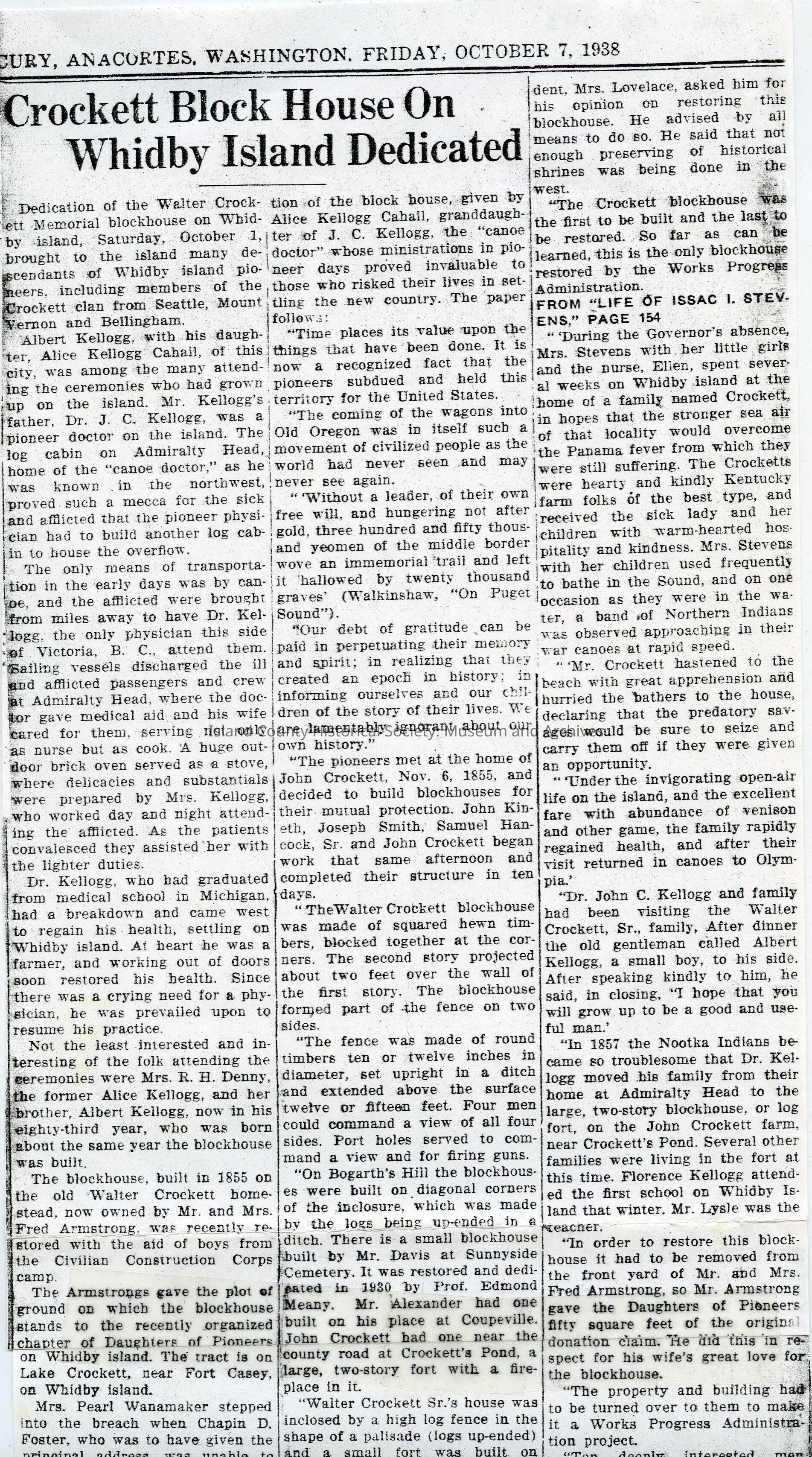 Photocopy of newspaper article on Crockett Block House on Whidby (sic) Island Dedicated October 7, 1938.Archive Details
