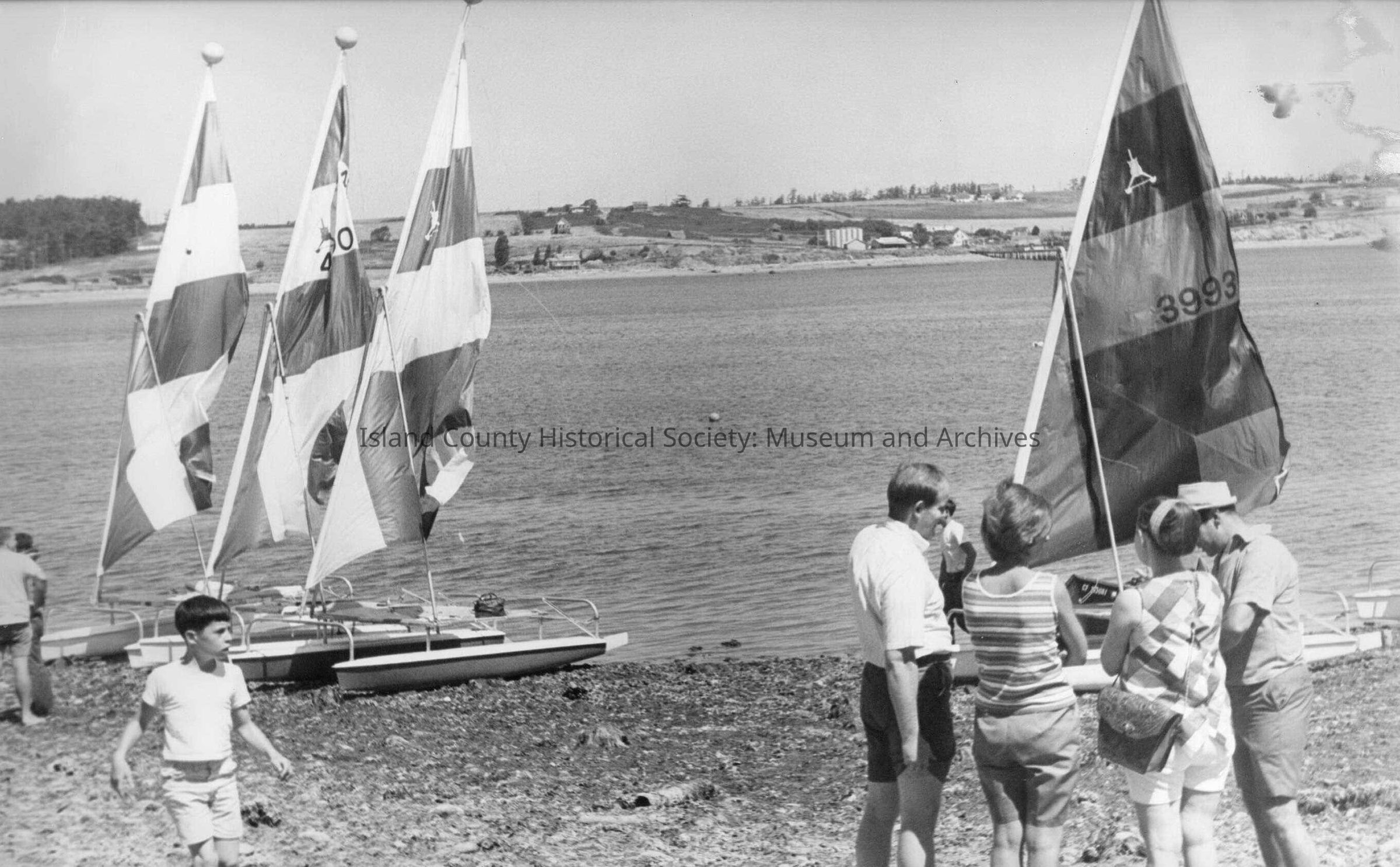 Part of a Wallie Funk photo display people on beach with small sailboats