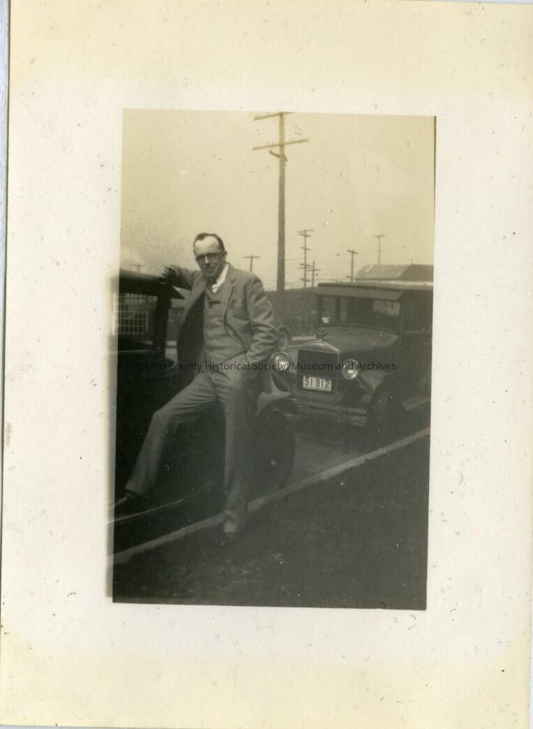A black and white photo of a man in a suit leaning against a car. Part of the car is cut off in the photo. There is another car parked behind it. There are powerlines visiable in the background. Howard Kellogg.