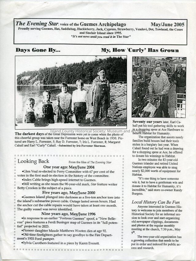 Photocopy of Evening Star - voice of the Guemes Archipelago may/June 2005. Earl Cahail.