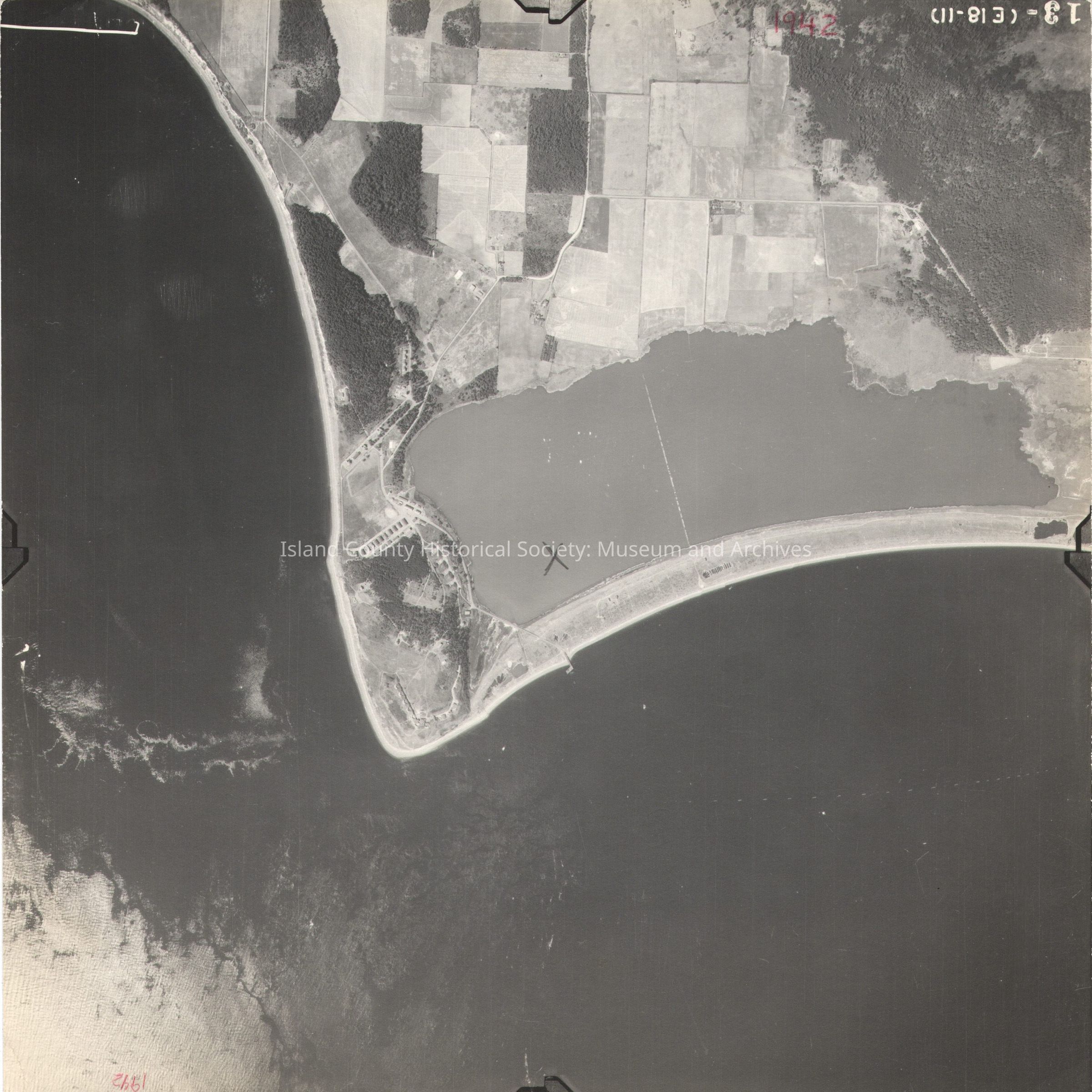 Donated by Island Conservation Adjacent to 2015.023.197 and 2015.023.199 13 (E18-11) Photo taken 17 Aug 1942 On back: "Copied Dec 20 1950" "(1942)" Ebey's Reserve, Crockett Lake See GIS for digital copies.