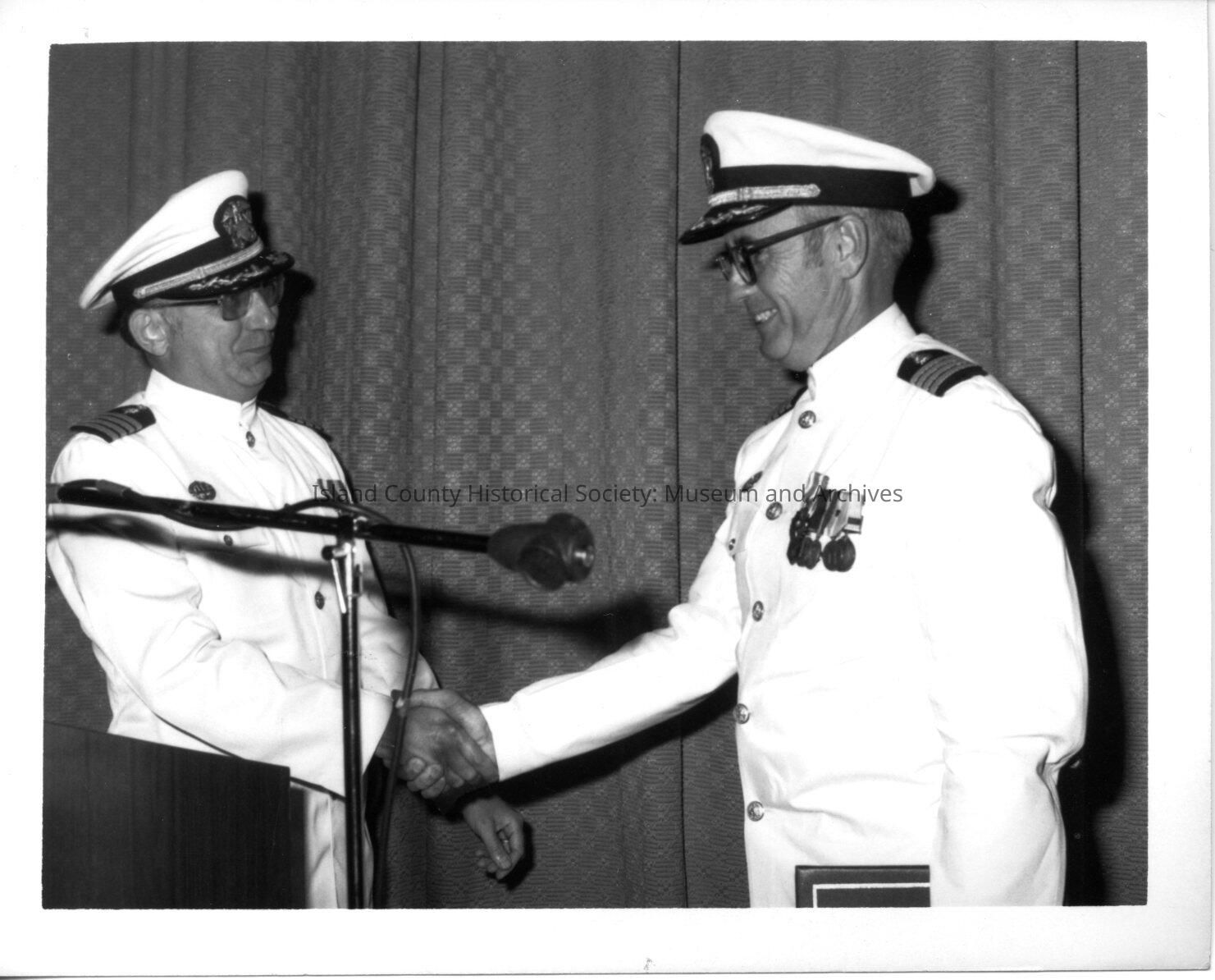 A photo of two navy officers shaking hands by a microphone. Handwritten on the back is "CDR L.P. SNAM-0123-C, Aug. 31, 1978." Black and white photograph.