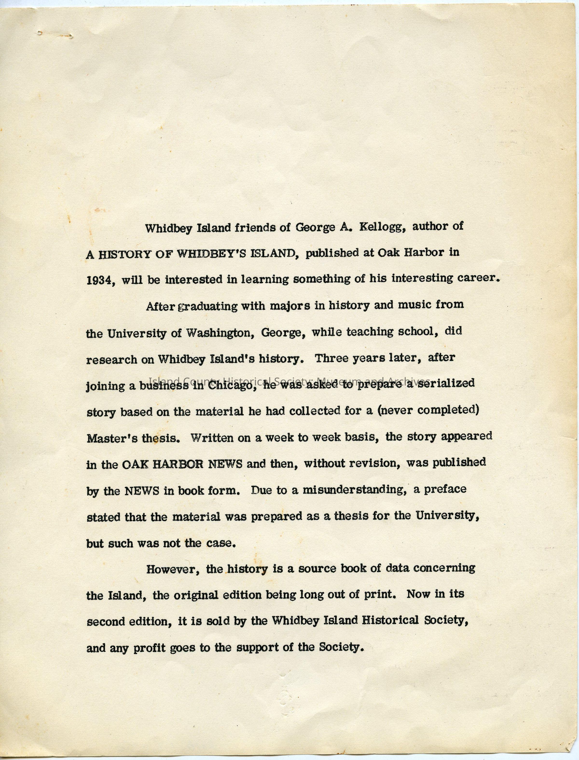 Typewritten notes - 5 pages. George A. Kellogg.