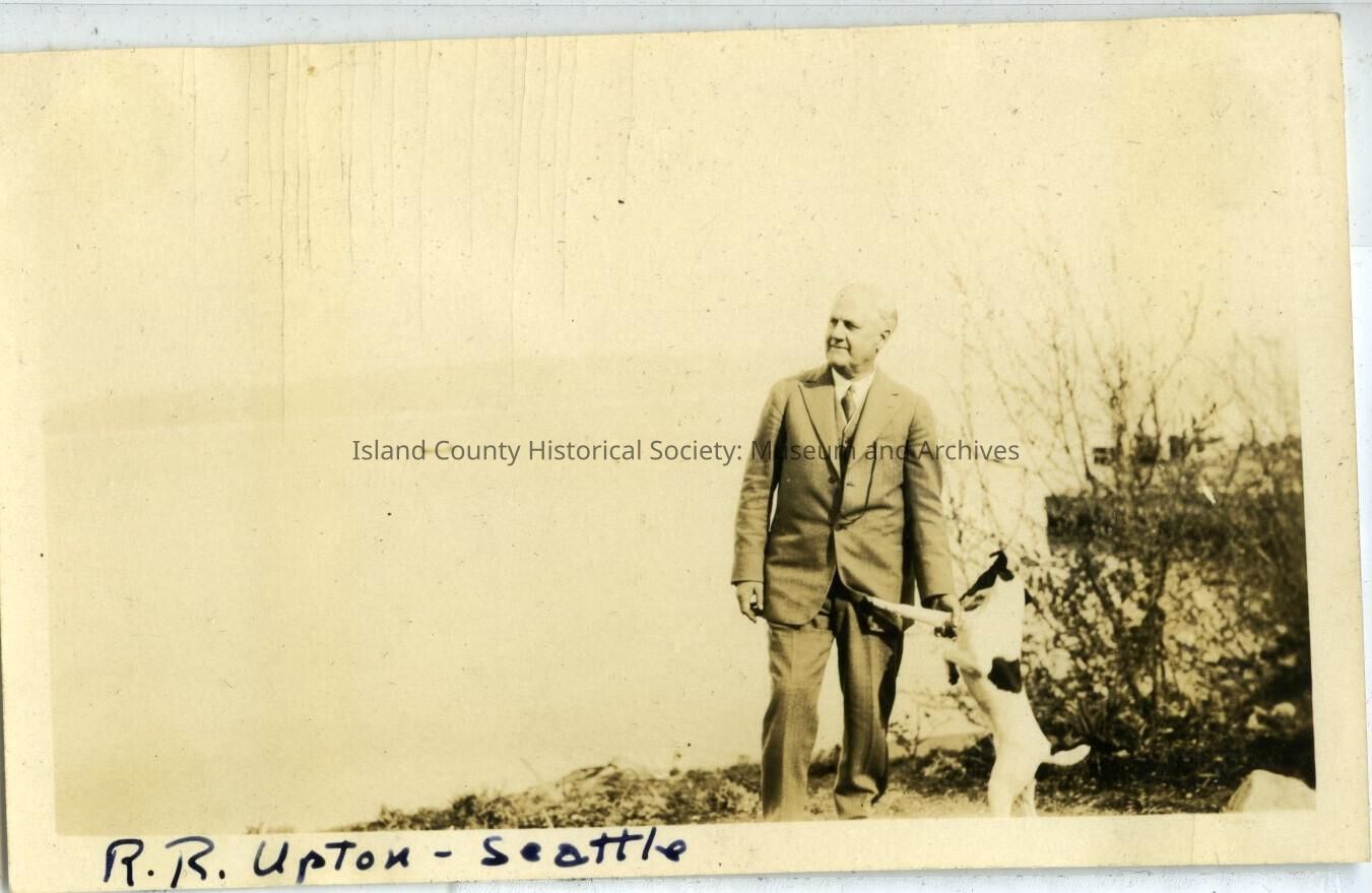 A black and white photo of a man standing next to a dog. The man is looking in the distance and is wearing a suit and tie. The dog is jumping on the man's leg. The bottom of the photo says, "R.R. Upton-Seattle".