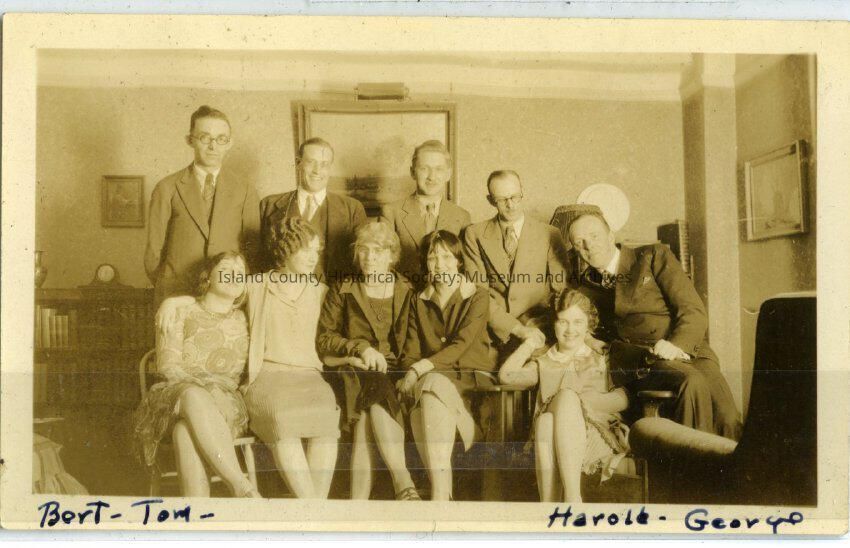 A black and white photo of a family. The back row of people is five men. The front row is five women. One of the couples are holding hands. All the women are wearing dresses and the men are all wearing suits and ties. The group is posed in a room with bookshelves and a few paintings on the wall. The bottom of the photo says, "Bert-Tom- Harold-George".