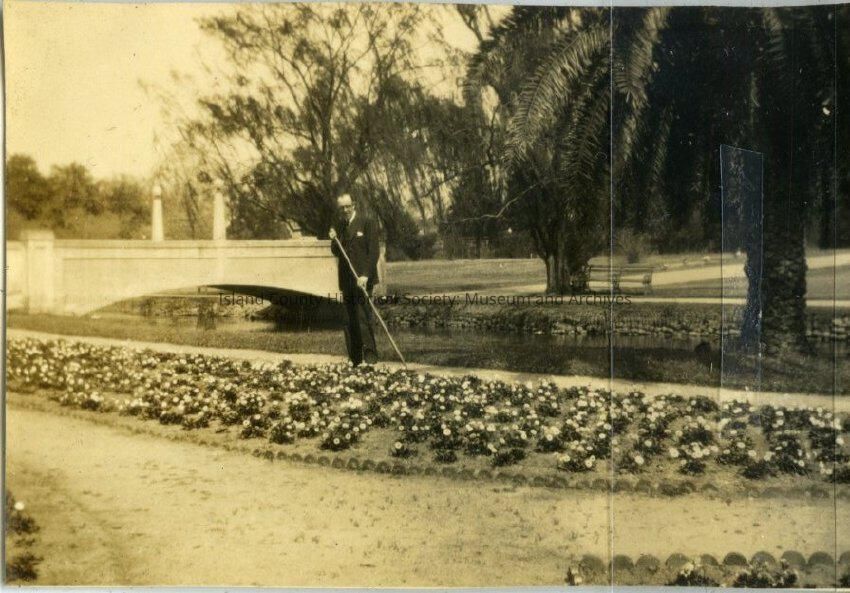 A black and white photo of a man gardening while wearing a suit. He has a hoe in his hands. He is near a small bridge and water. There is a palm tree in the background. George Kellogg hoing in suit.