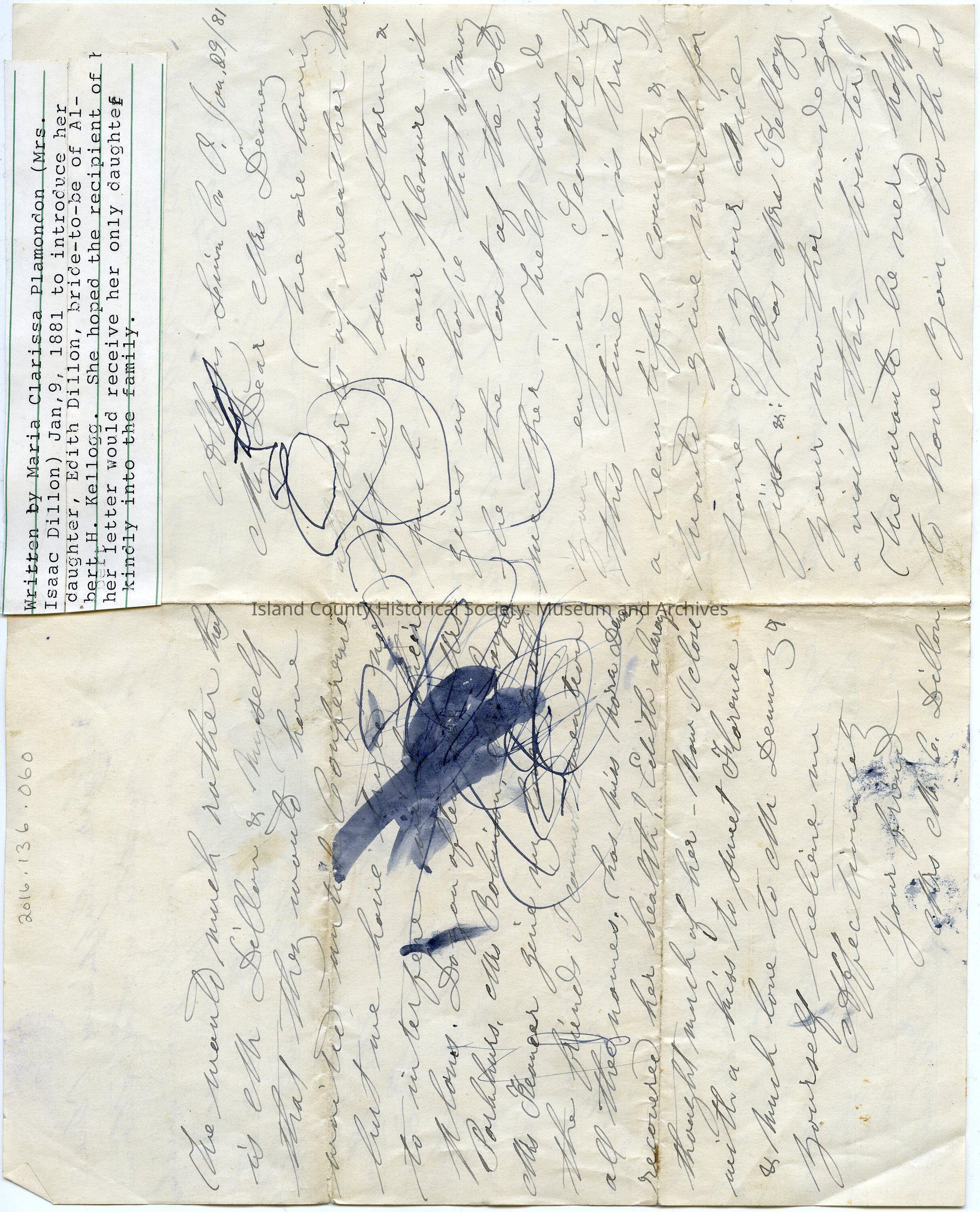 Handwritten letter - Jan 09, 1881. To Ellis Denny. From Miss Dillon. Typed noted - written by Marie Plamondon.Archive Details
