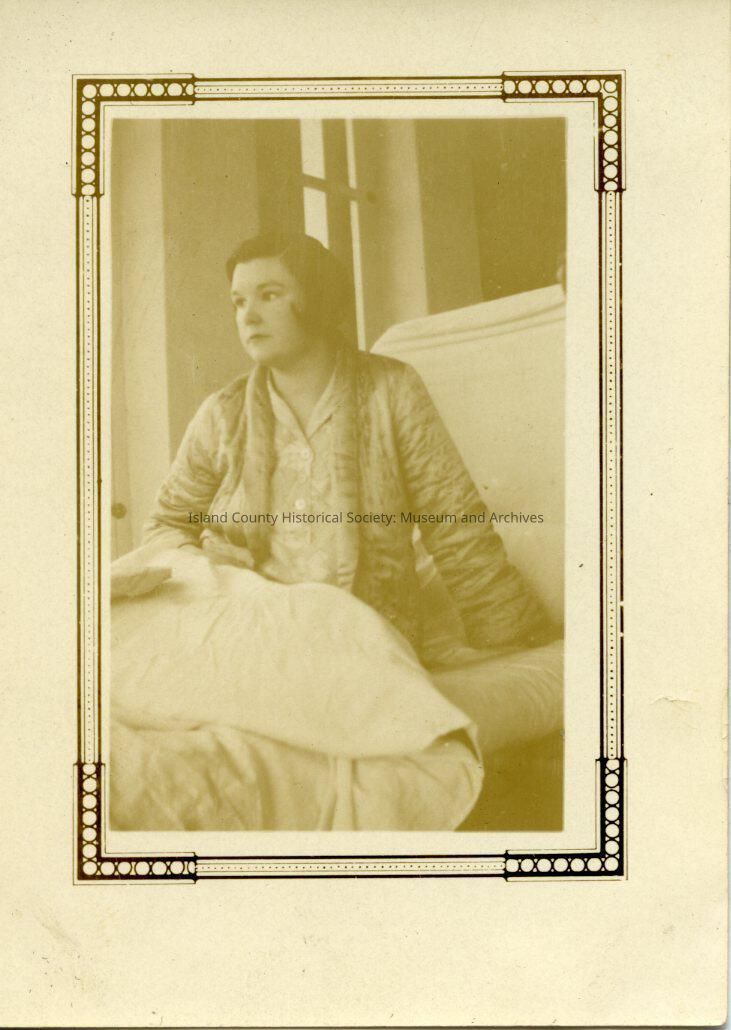 A black and white photo of a woman sitting up in bed. She is looking away from the camera and is wearing pajamas and a house coat. She is half covered with blankets. The back of the photo says, "May 1st".