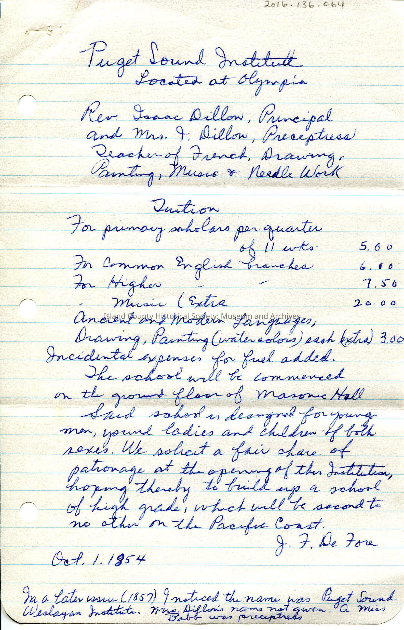 Handwritten - 4 pages - Puget Sound Institute. Rev. Isaac Dillon.