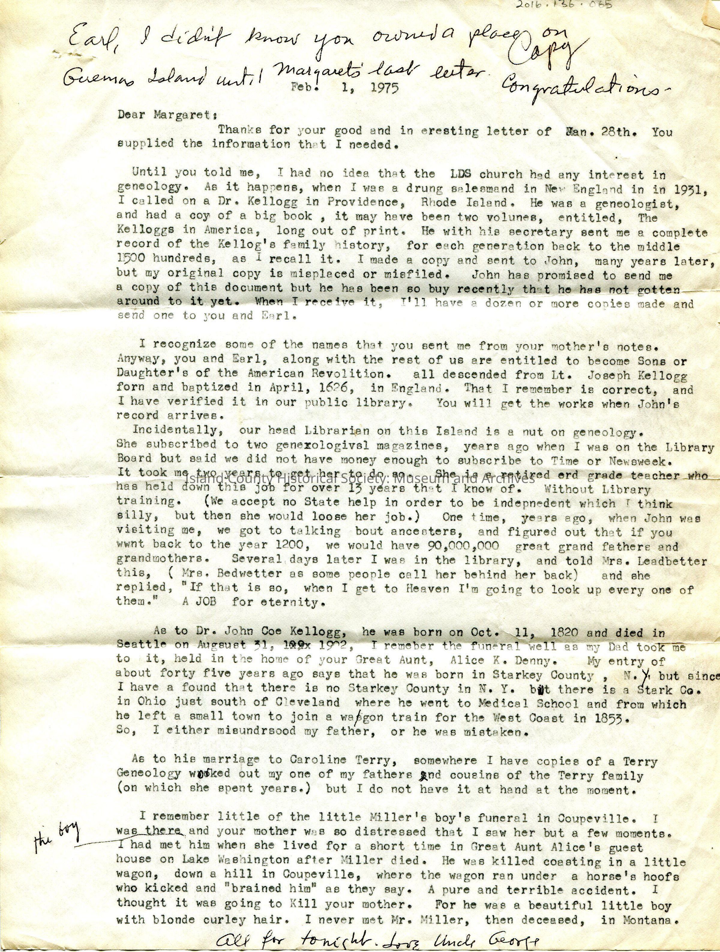 Handwritten notes on typed letter Feb 1, 1975. To Margaret from Uncle George.