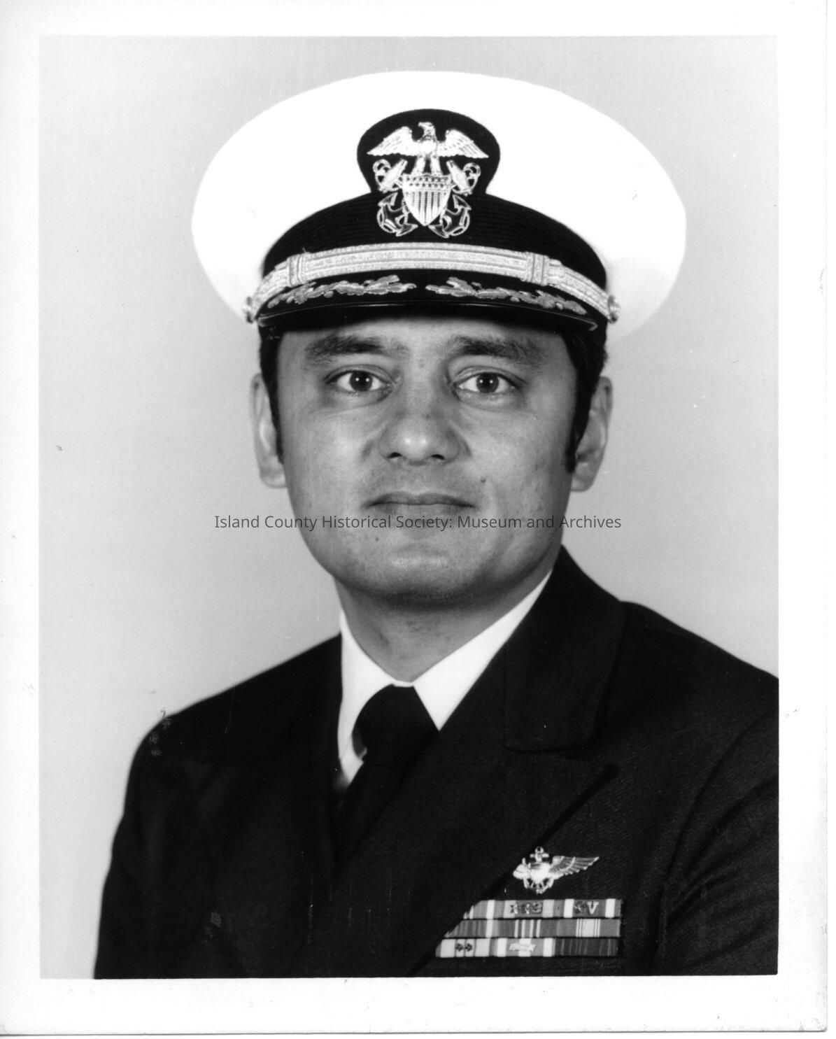 A photo of a navy officer. Handwritten on the back is "Commander John Juan, USN." Black and white photograph.