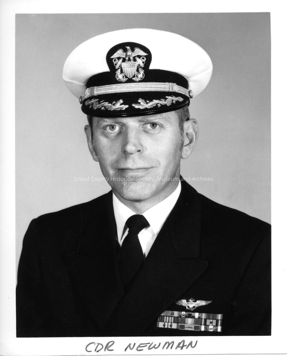 A photo of a navy officer. Handwritten on the back is "CDR Newman." Also written on the front bottom of photo. Black and white photograph.