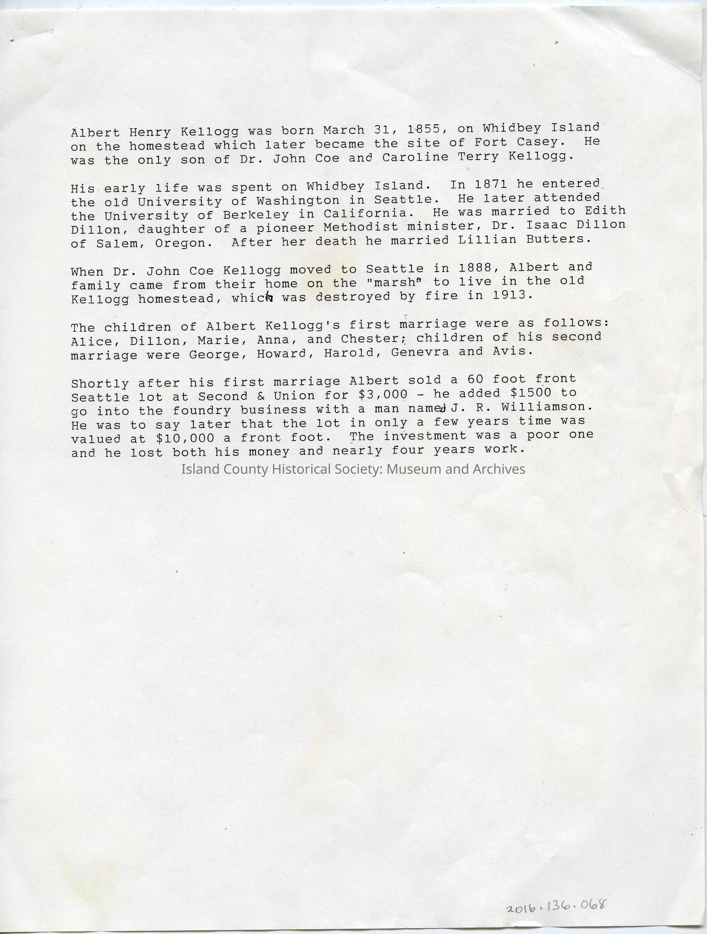 Biographical data on the life of Albert Henry Kellogg.