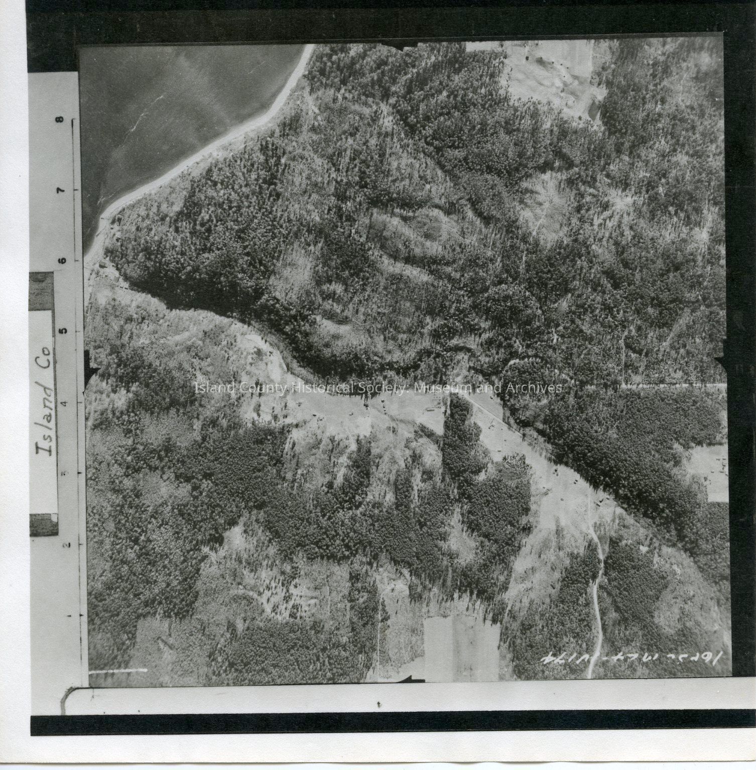 SE shore of Whidbey Island north of Possession Point. Majority of photo is land with the SE corner as water. Two main roads can be seen amongst forest land and a few agricultural fields.