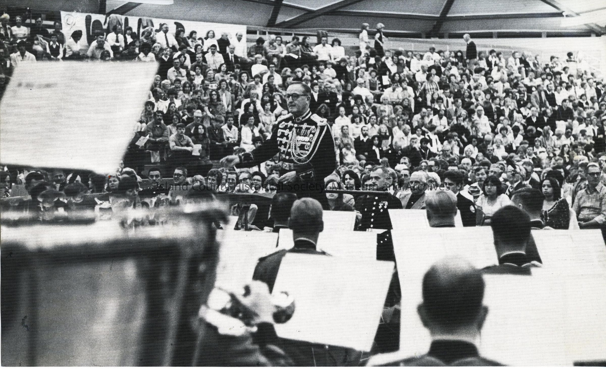 A photo of a navy orchestra leader in front of the orchestra with a crowd listening to the music. Black and white photograph.