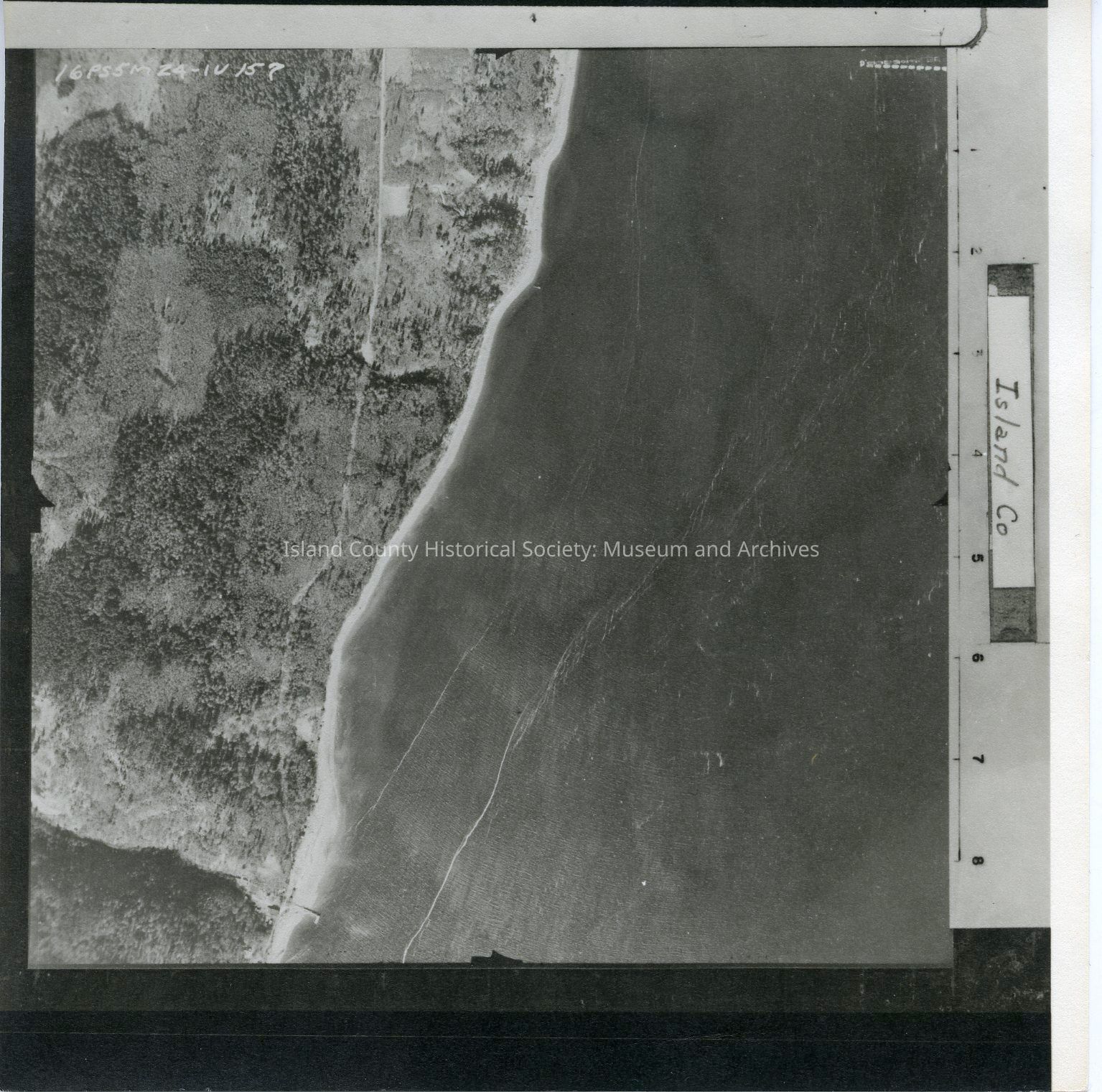 SE shore of Whidbey Island north of Possession Point. Almost half of photo is water with the W side as land. Two roads lead from a dock in the south.