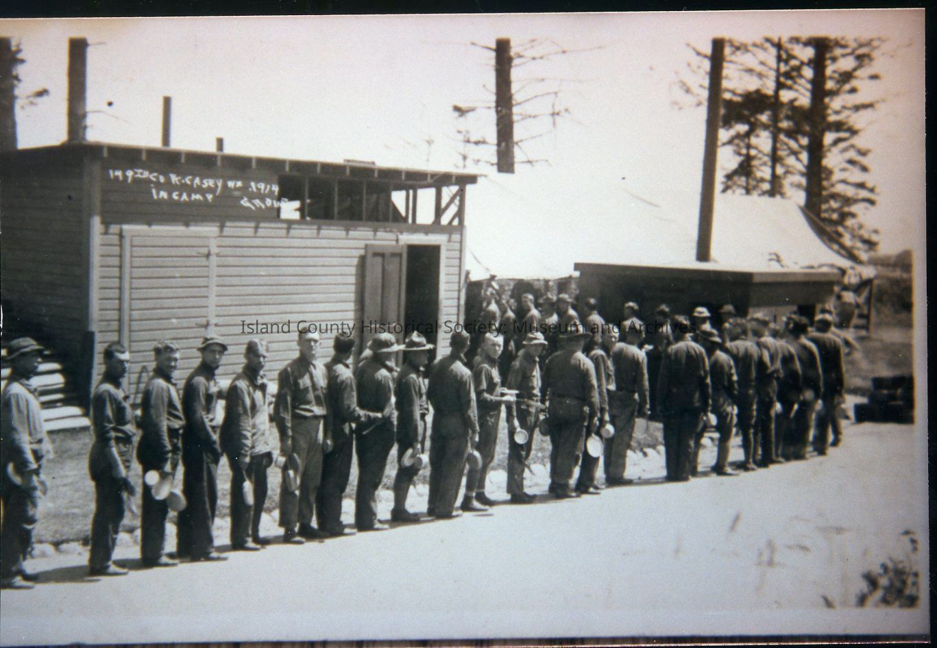 Photograph of the 149th Company at Fort Casey, possibly queuing for food. C. 1919. Photo by Perry Grove.Photograph Details