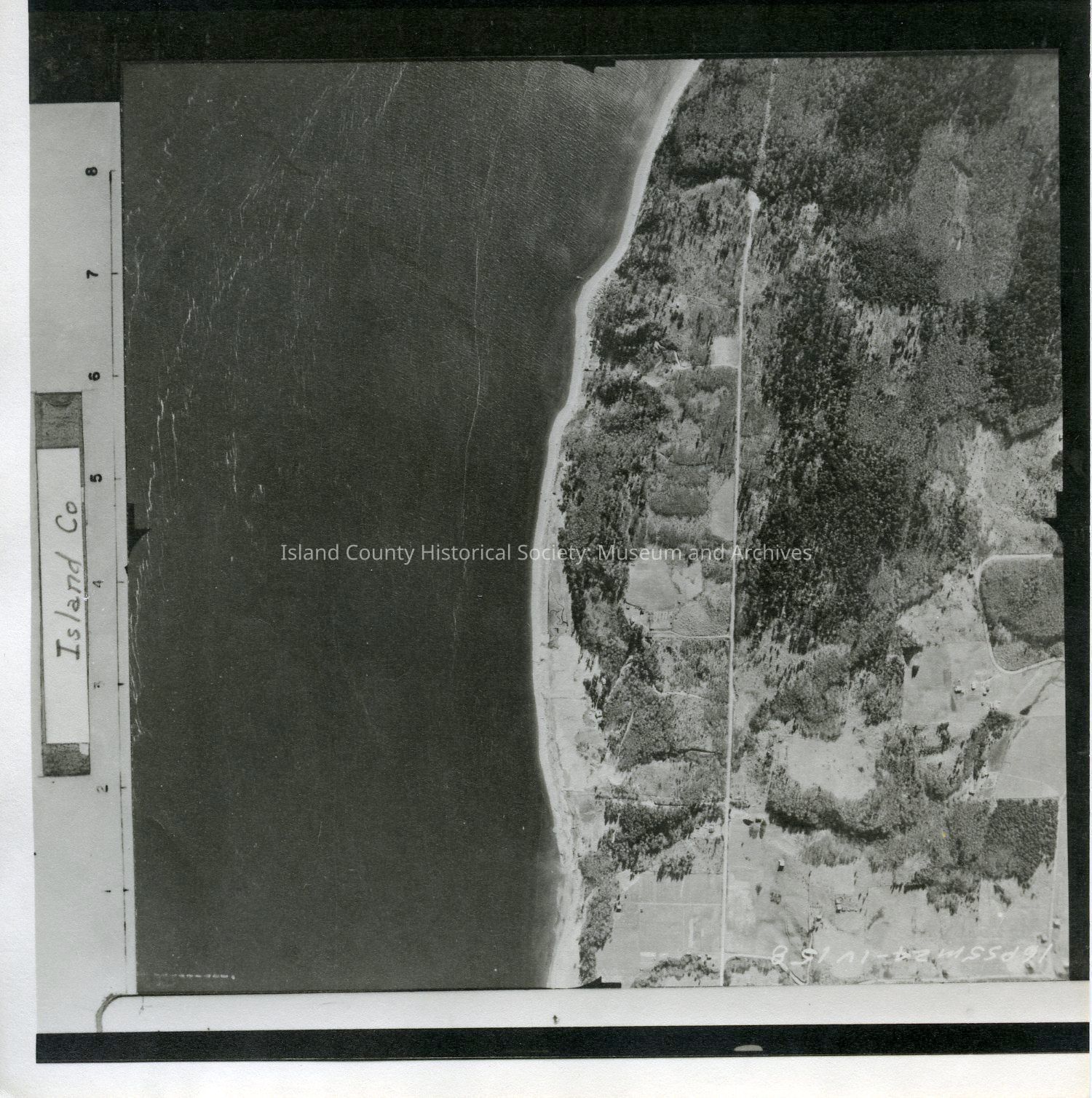 SE shore of Whidbey Island south of Clinton. Almost half of photo is water with the W side as land. A road runs N to S parallel to the coast.