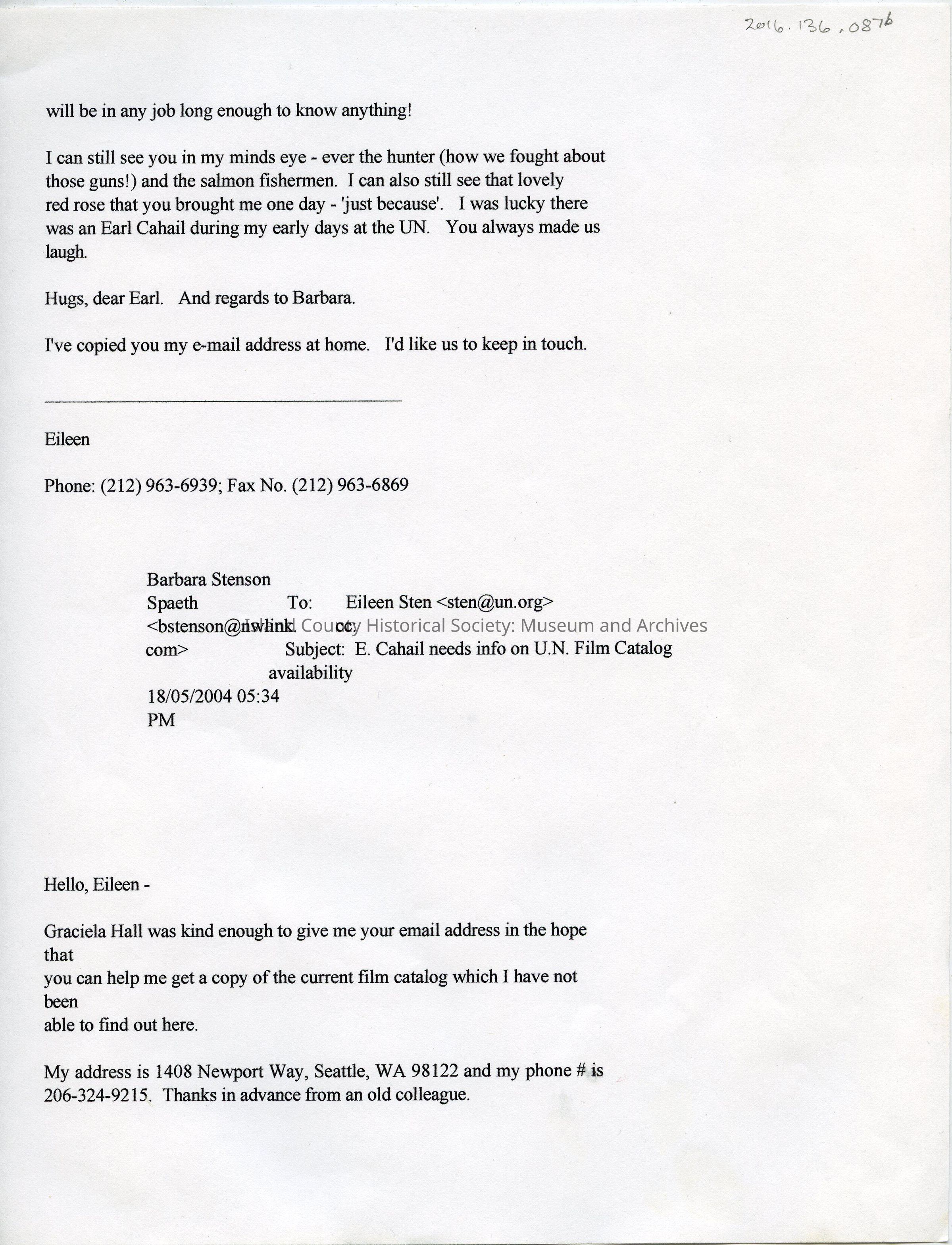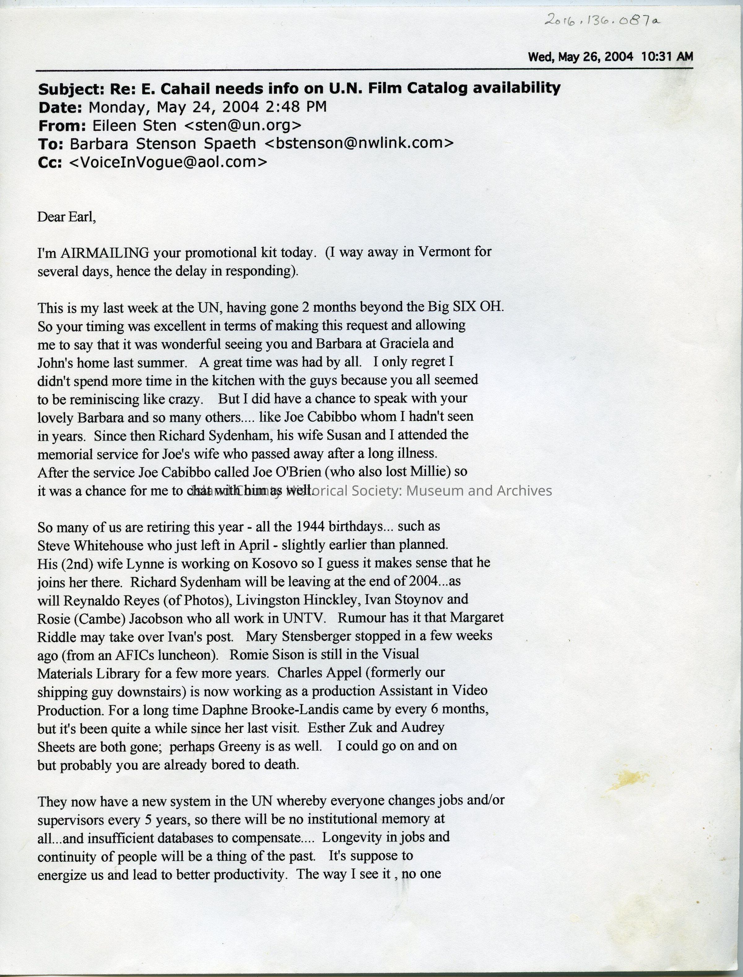 May 24, 2004 letter from Eileen Sten to Earl Cahail regarding UN Film Catalog promotional kit and Eileen Sten's retirement from UN (pages a and b).Archive Details