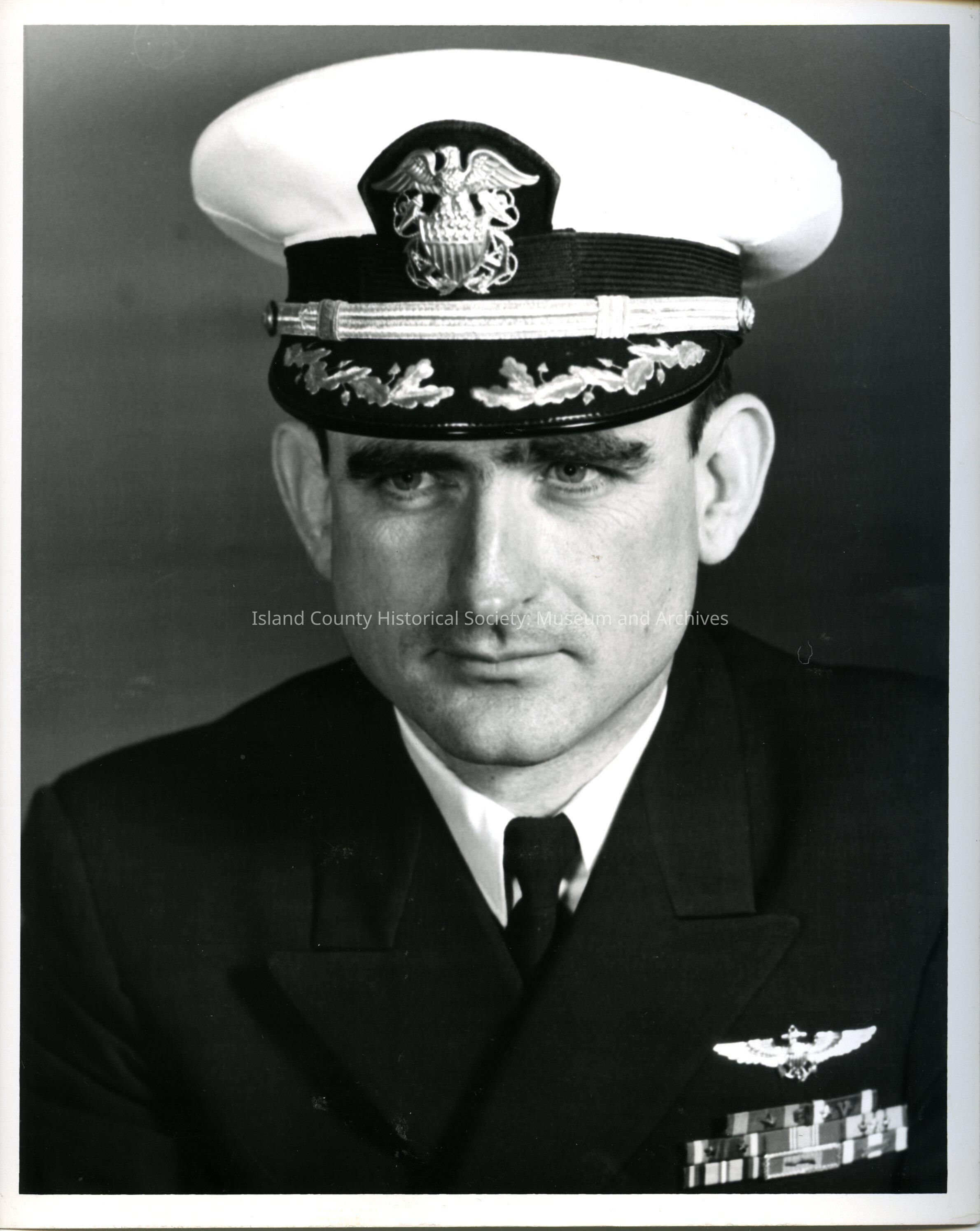 A photo of a navy officer. Typed on the back is "CDR D.L. Kerr." Black and white photograph.