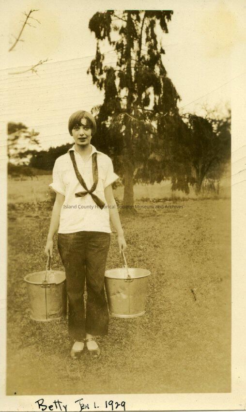 A black and white photo of a young woman standing outside with a tin bucket in each hand. She is wearing dark colored pants and a white t-shirt with a dark colored tie/scarf. She is outdoors in an open area with just a few trees in the background. The bottom of the photo says, "Betty, Jan 1, 1929". Harold Kellogg's wife, Lucile (Betty) Clark.Made/Created