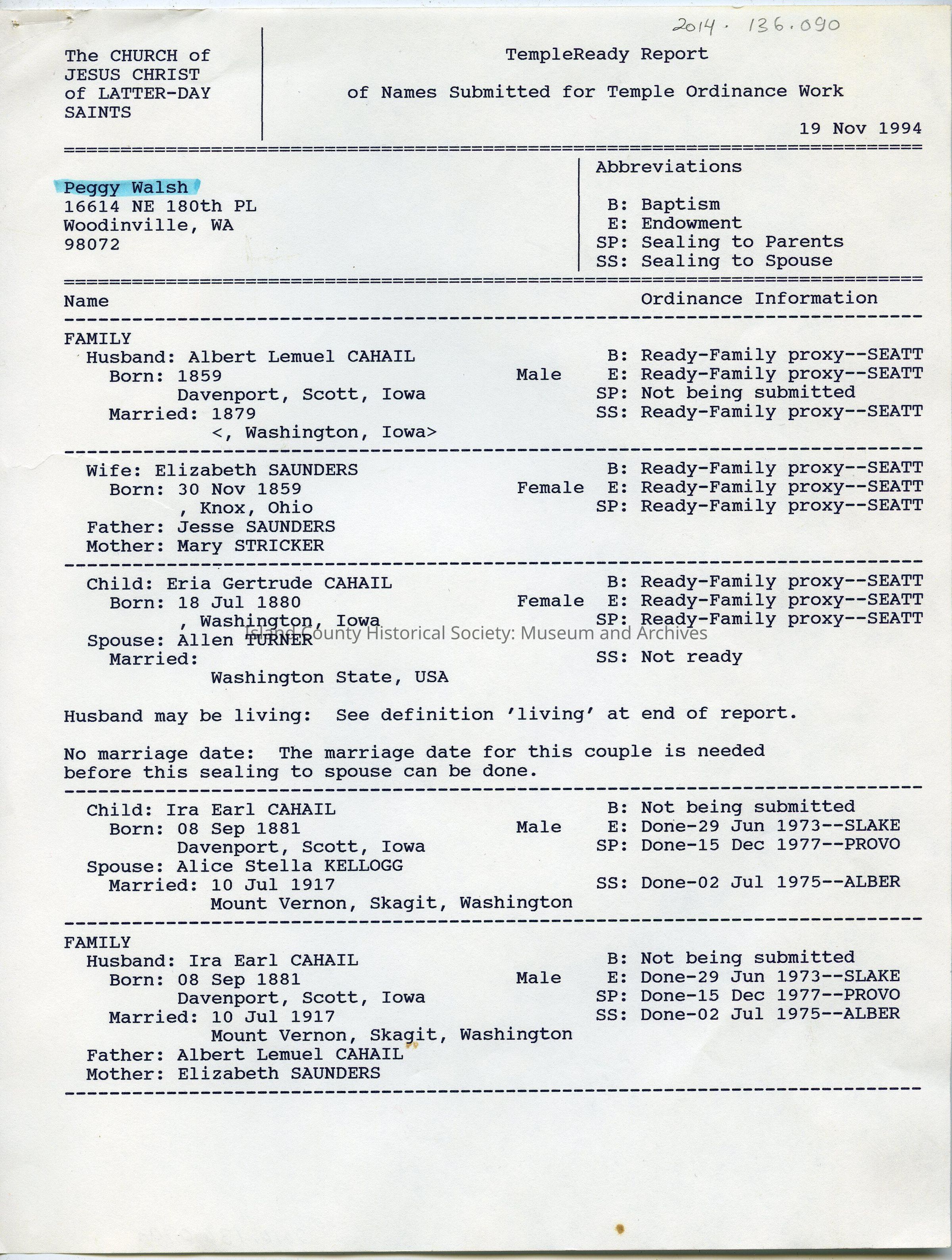 November 19, 1994 - The Church of Jesus Christ of Latter-Day Saints - Typed TempleReady Report of Names Submitted for Temple Ordinance Work (11 pages a through k). Report of the Cahail and Kellogg family history.Archive Details