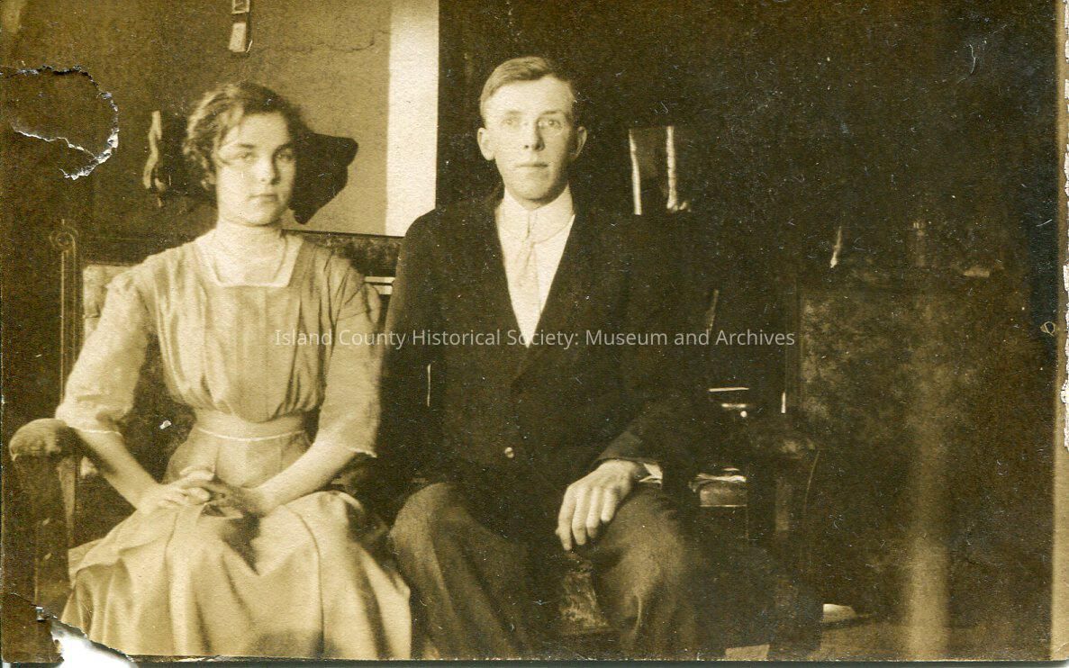 A black and white photo of a young couple sitting next to each other. The girl is wearing a modest dress and has her hands folded on her leg. The young man is wearing a suit, tie and glasses. The back of the photo says, "Jan. 31, 1912. Tacoma. Or 12/31/12".