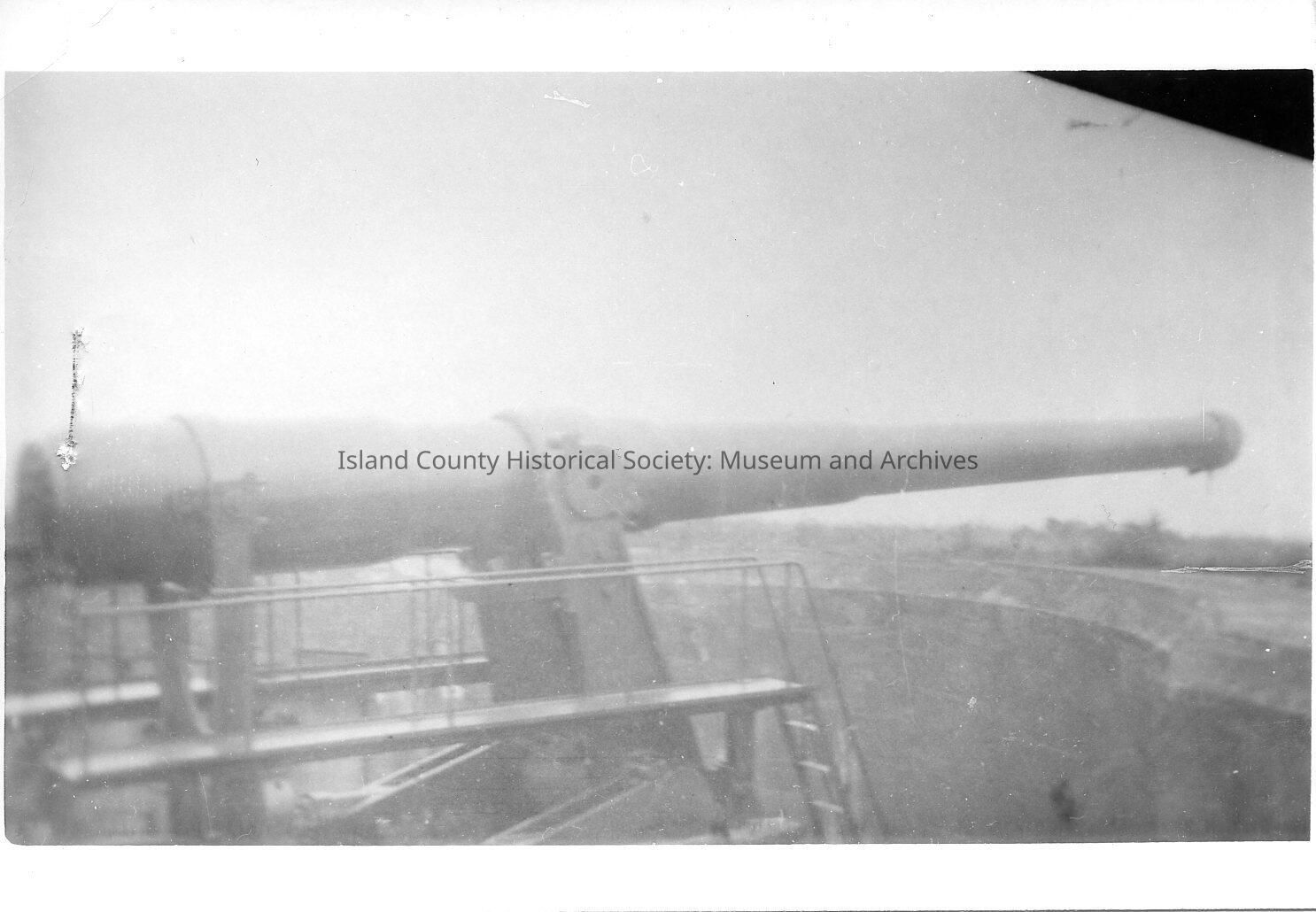 Closeup of disappearing gun raised above battery wall. Note on envelope reads: Battery Russell, Ft. Stevens? From old entry: Photo with negative: Battery Russell; 10" disappearing gun