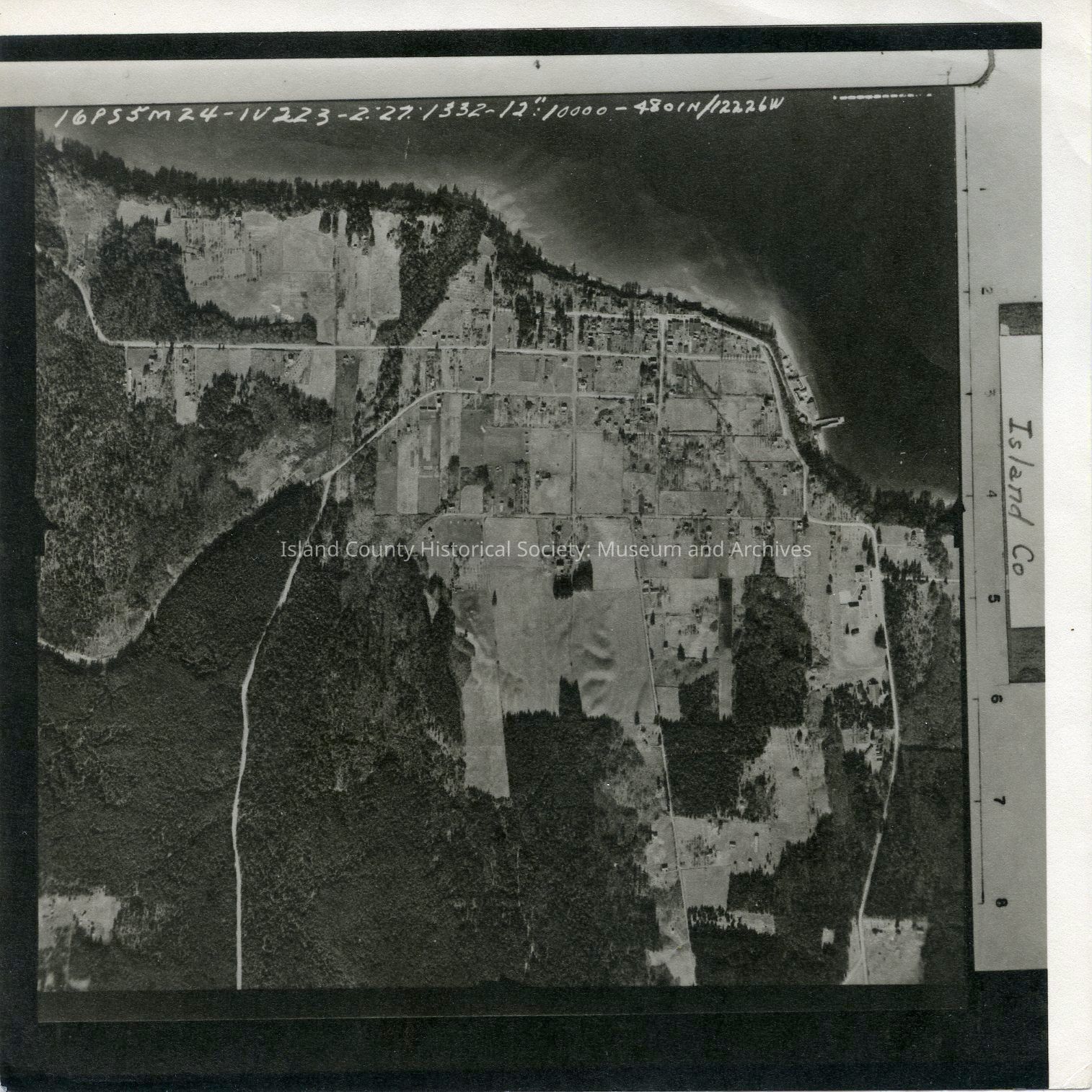 Langley, Whidbey Island. Most of photo is land with water on the north edge. Two roads leading to Langley can be seen.