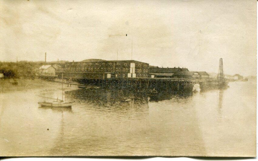 A black and white photo of a pier/wharf/water-front area. The foreground of the photo is water and one small boat in the water. The background is the pier and buildings. There are no people visible.