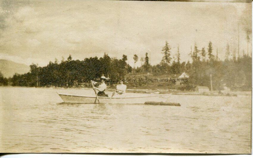 A black and white photo of two women on a small boat in the water. Each woman is wearing a skirt and blouse. Each woman has a ore in their hands. The boat is named "Belle". There are trees and houses visible on the shore behind them.
