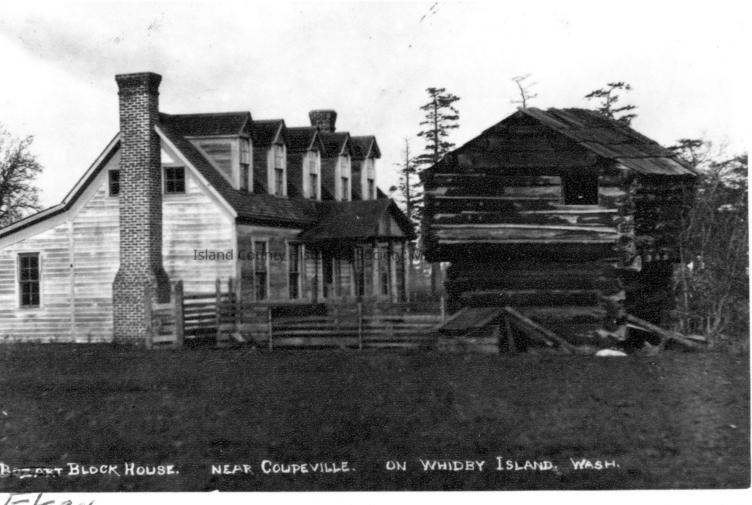 The Ebey home before dormers were removed. J. Ebey blockhouse - when Bozart was living in house - note gables or dormers - not original and later removed.