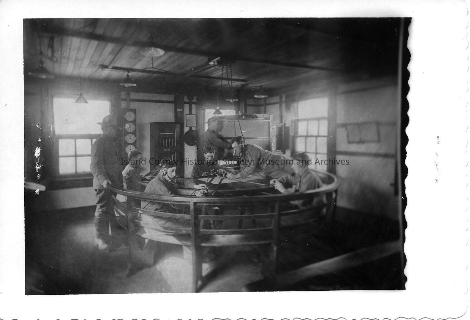 Plotting room at Ft. Worden. Round table surrounded by continuous bench. Four soldiers are seated and another leans upon the table. Three wear earphones. Another soldier stands at chalkboard in rear and another in hat looks on. Windows are open.